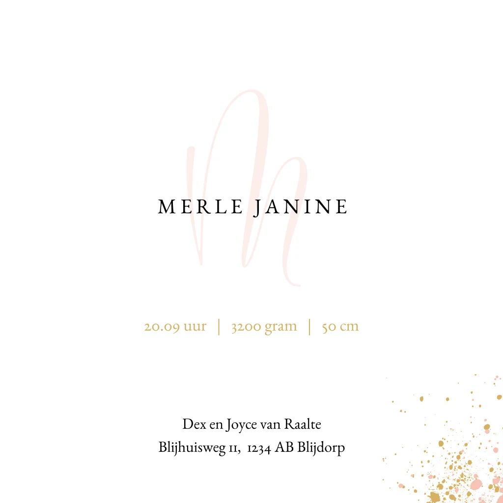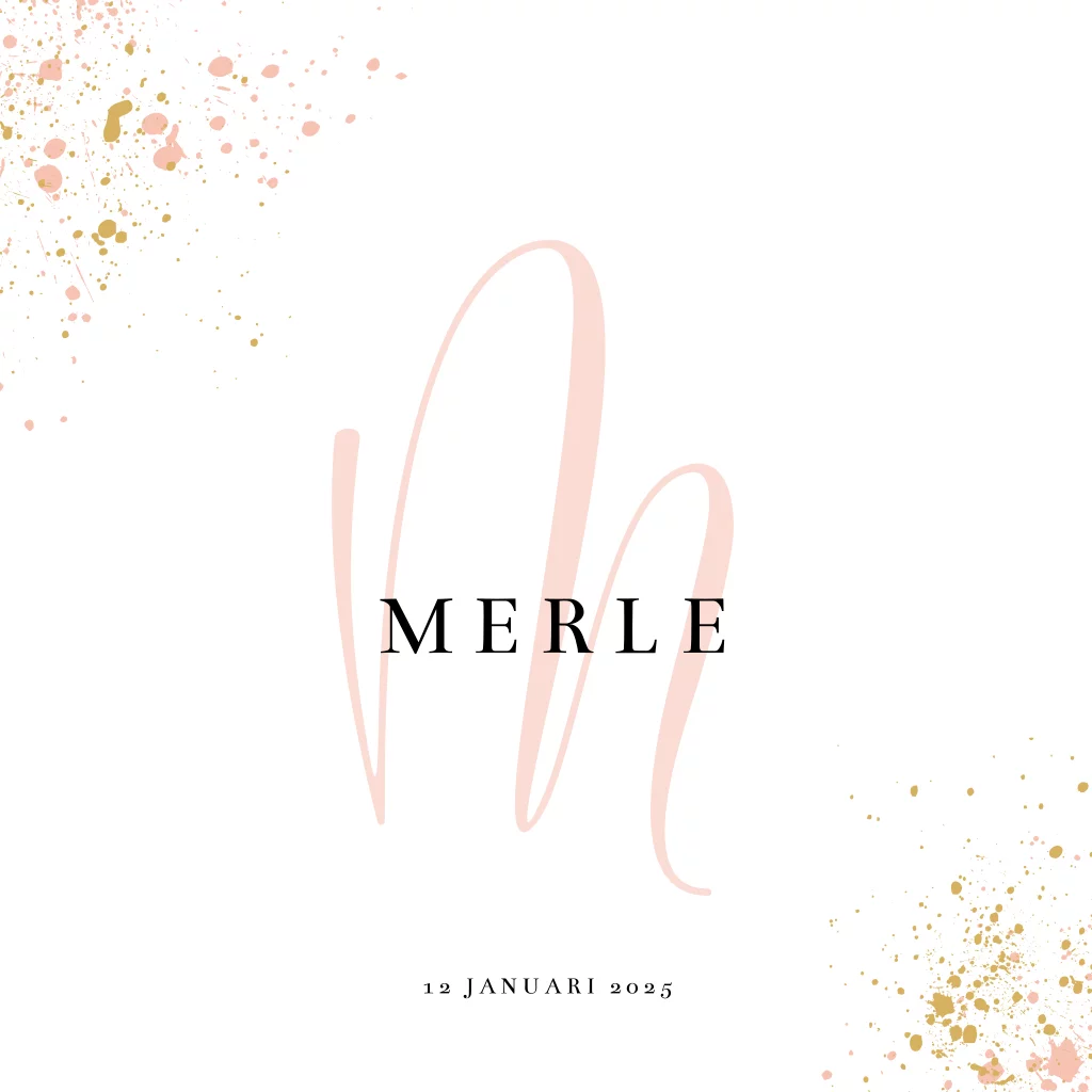 Rustig en clean geboortekaartje waarop de eerste letter van de naam van jullie baby er helemaal uitspringt! Op dit meisjes kaartje Merle zijn de kleuren perzik roze en geel goud gebruikt. Dit is eenvoudig aan te passen naar je eigen wensen. Het geboortekaartje is gedecoreerd met wat spetters die een leuk effect geven.