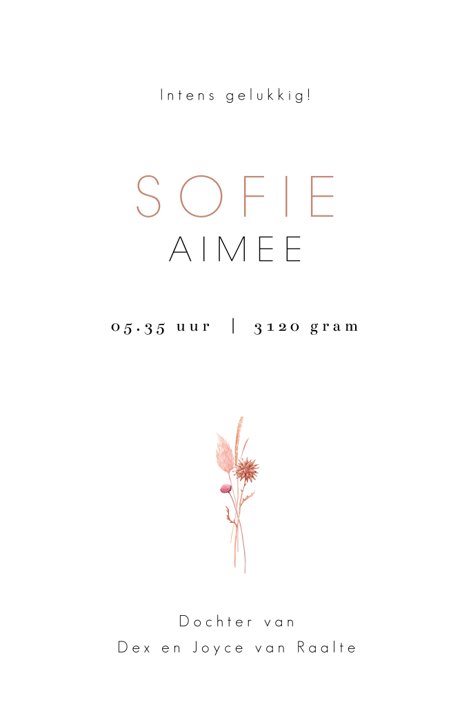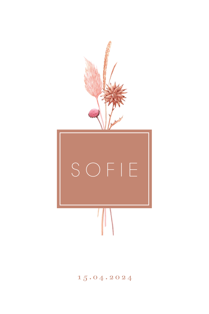 Rustig lief geboortekaartje voor een meisje met een klassiek tintje. Op de voorkant staat een een droogbloem in zachte tinten. Het droogboeketje bevat verschillende gras soorten wat een lieve uitstraling geeft. Deze minimalistische babykaart Sofie is eenvoudig zelf aan te passen.