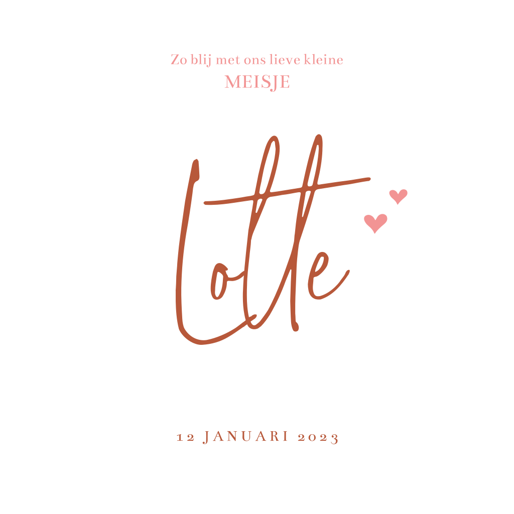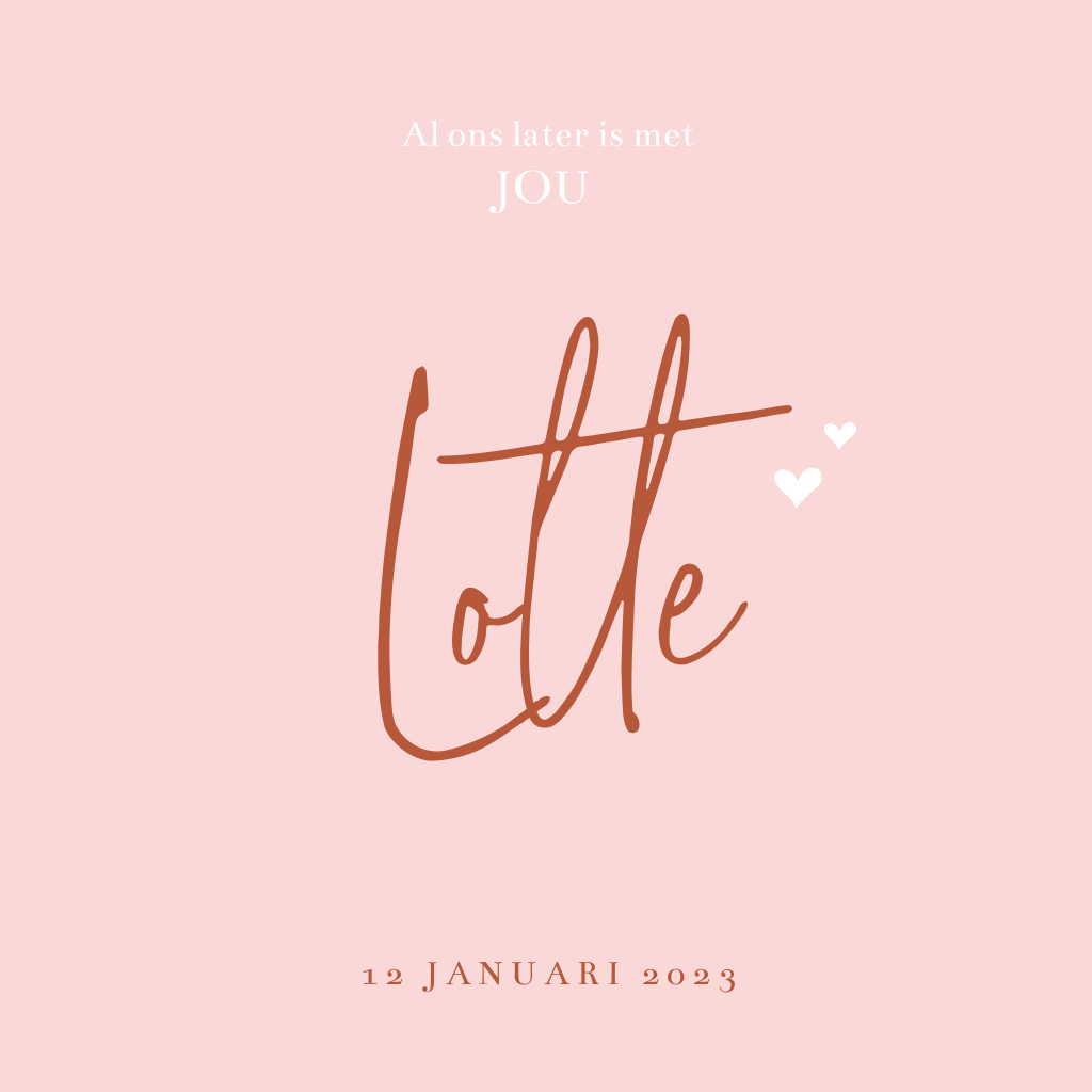 Modern geboortekaartje voor een meisje. Dit kaartje met de baby naam Lotte heeft een oud roze achtergrondkleur gecombineerd met tekst in wit en koperkleur. De naam in sierlijke letters springt er heel mooi uit! Verder heeft de kaart een rustige uitstraling. De kleine hartjes maken het kaartje compleet.