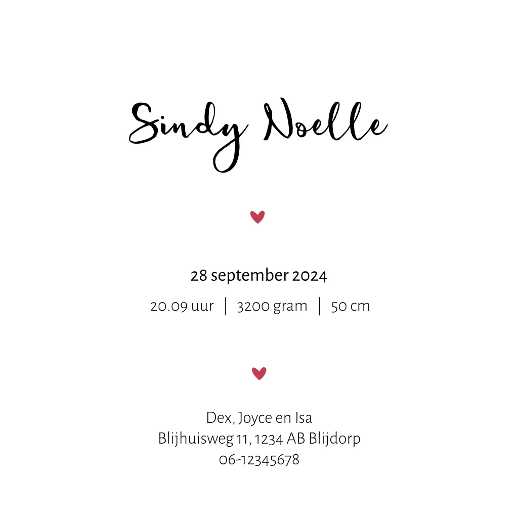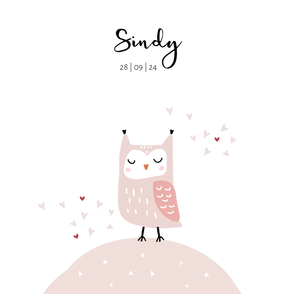 Een rustig geboortekaartje voor een meisje met een lief uiltje. Op dit babykaartje Sindy staat een mooie uil in zalm roze tinten het kleine uiltje heeft de oogjes gesloten. Rondom het uiltje staan kleine hartjes. Deze kaart is eenvoudig aan te passen.