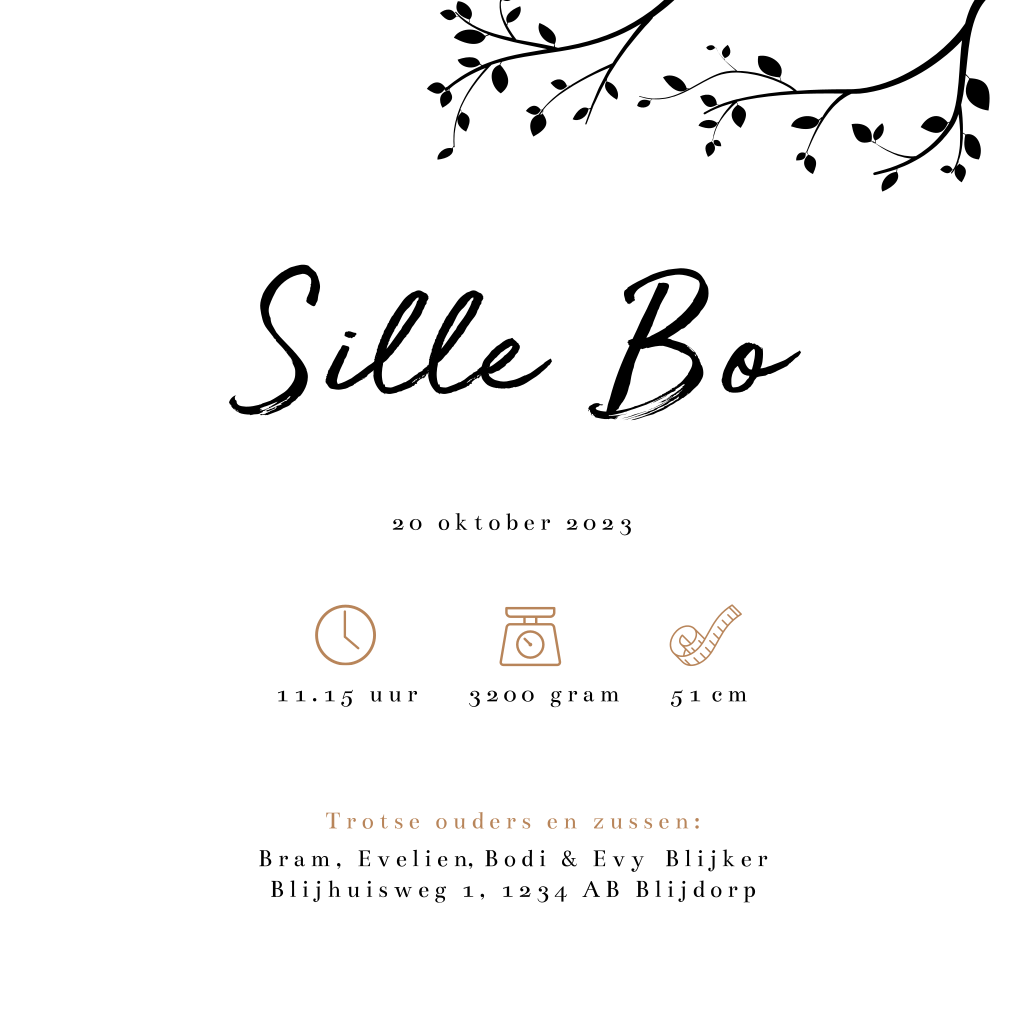 Hip roze silhouet geboortekaartje met 3 kindjes voor wanneer er een derde dochter op komst is. Op dit babykaartje Sille zie je 2 grote zussen met een karretje waarin een klein baby zusje zit. Verder op dit kaartje een boom met eekhoorntje en paddenstoeltjes. Teksten en kleuren, evenals het silhouet zijn aan te passen in de editor. Ook mogelijk voor een andere gezinssamenstelling.