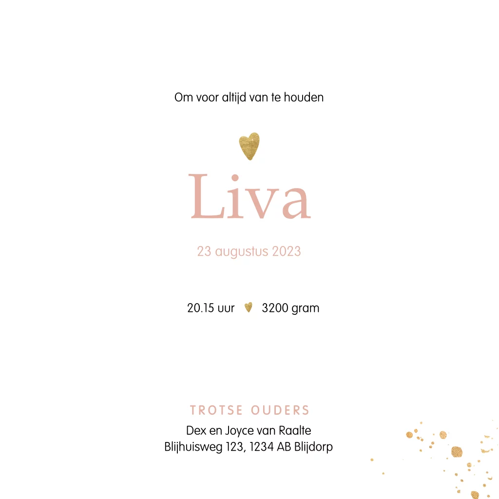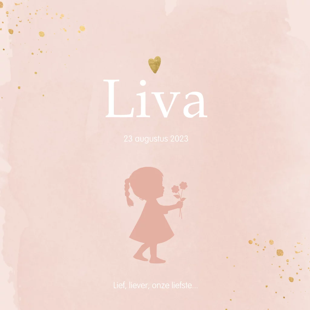 Lief en hip geboortekaartje voor een meisje met een roze aquarel achtergrond, gouden spetters en gouden hartje. Op dit kaartje Liva staat een silhouet van een meisje met bloemetjes in haar hand. Ook mogelijk met een ander silhouet, dit is aan te passen in de editor.