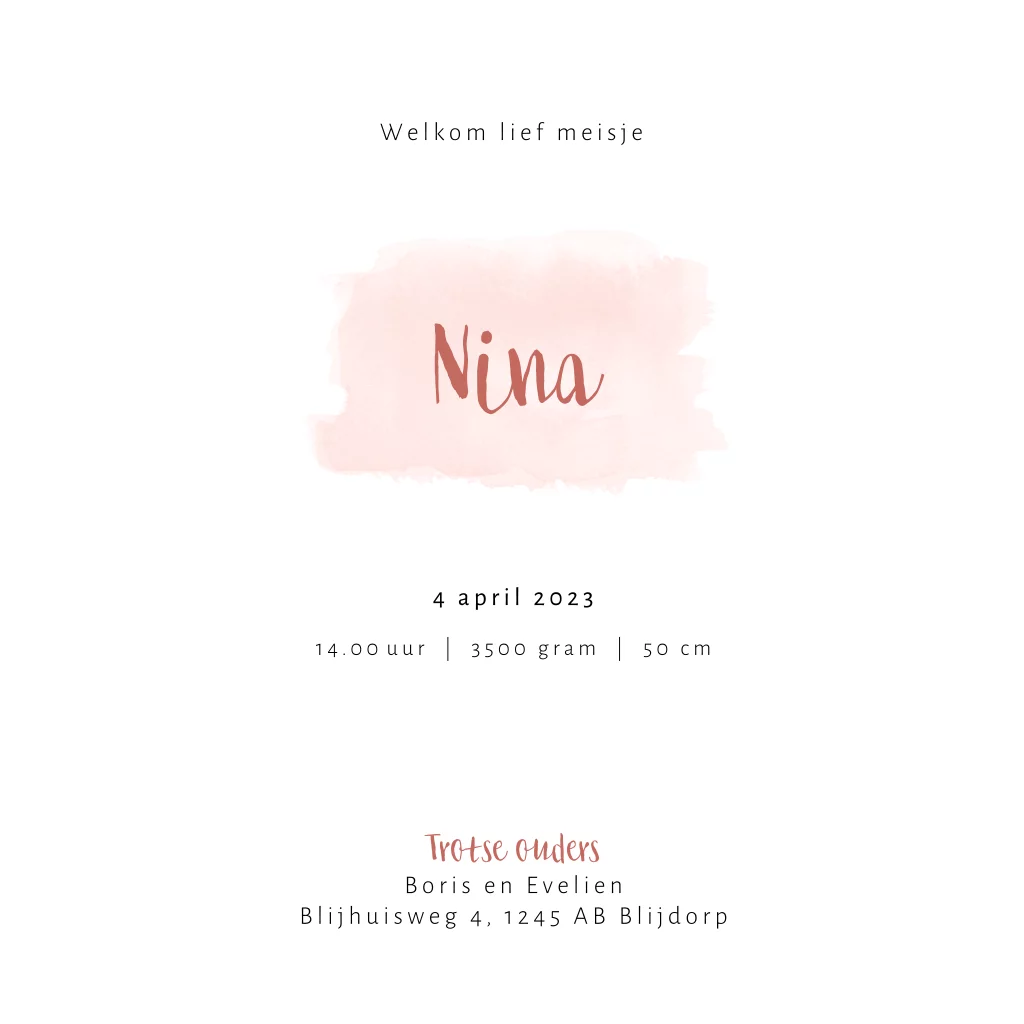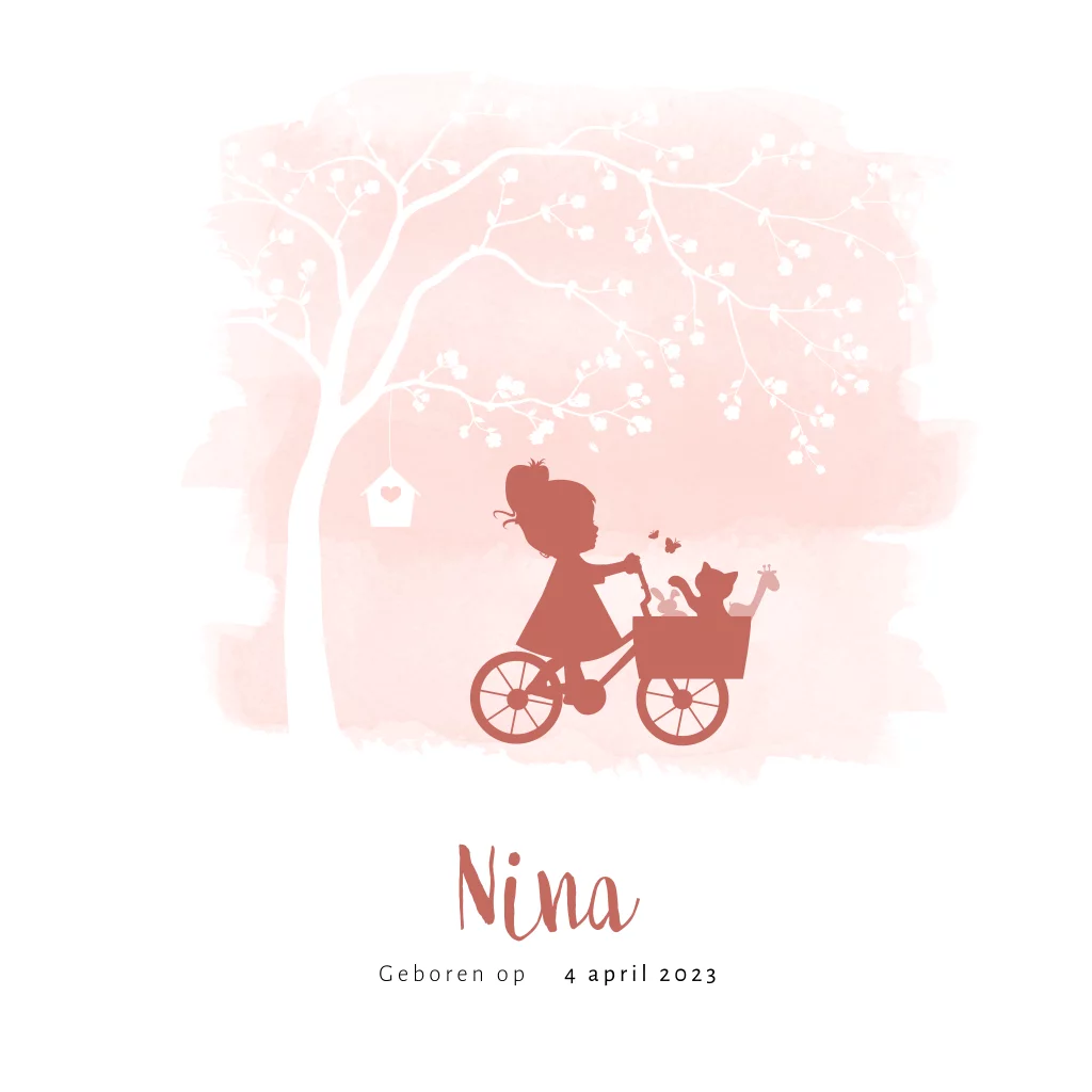 Geboortekaartje voor een dochter met een silhouet van een meisje op de bakfiets. In het bakje zitten een poesje en 2 kleine knuffeltjes. Op de achtergrond van dit kaartje Nina een aquarel, boom en een vogelhuisje. Teksten en kleuren, evenals het silhouet, zijn aan te passen in de editor.