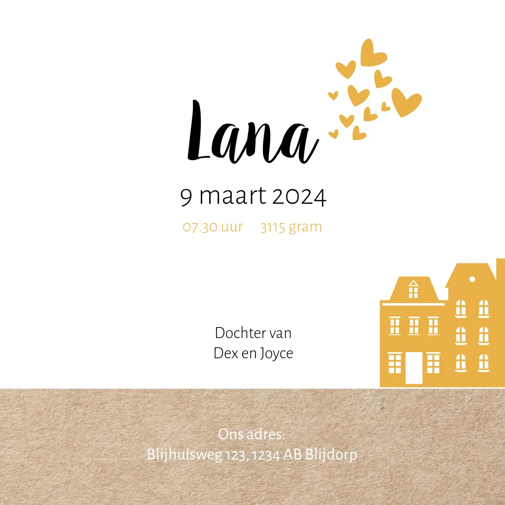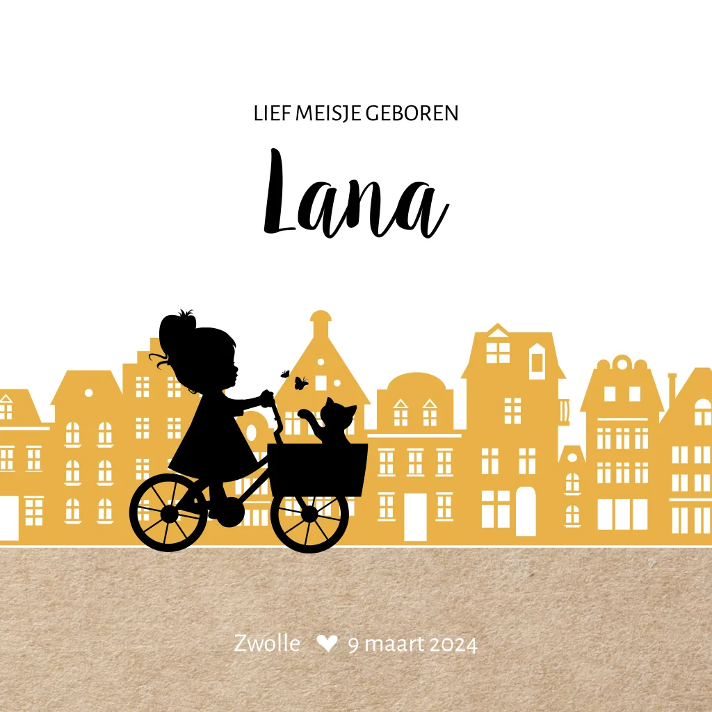Silhouet geboortekaartje met een meisje op de bakfiets samen met haar poes. De vrolijke gele huisjes op de achtergrond en een karton look aan de onderkant maken de kaart compleet.