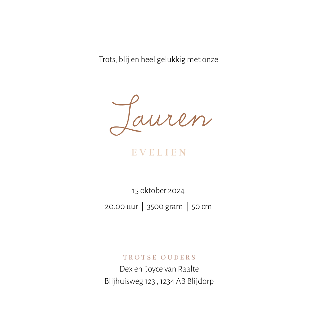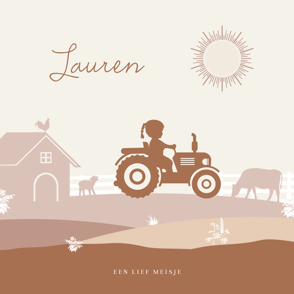 Silhouet geboortekaartje met een klein meisje die op de tractor over de landerijen rijdt. Het zonnetje schijnt, de kip zit op het hok, de koe graast in de wei en een klein lammetje staat bij het hek. Een hip kaartje met trendy kleuren in boerderij thema. Teksten, kleuren en de silhouetten van dit kaartje Lauren kun je gemakkelijk aanpassen in de editor.