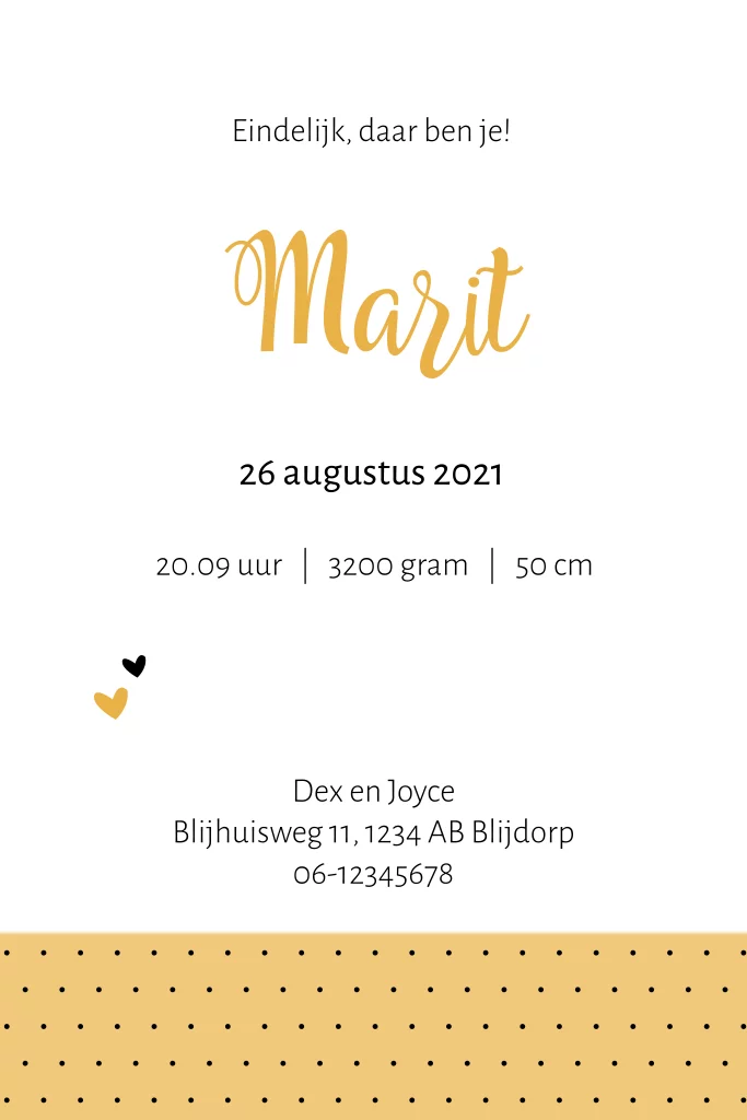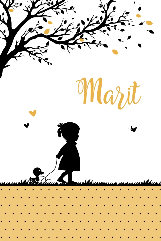 Leuk silhouet geboortekaartje voor een meisje. Op dit kaartje heeft het meisje een speelgoed eendje aan een koordje. De vallende bladeren geven het gevoel van de herfst aan. Om het meisje zie je een paar hartjes en een kleine vlinder. Dit babykaartje met de naam Marit heeft een stippen patroon aan de onderzijde. De combinatie met de kleur okergeel met zwart geeft de kaart een hippe look.