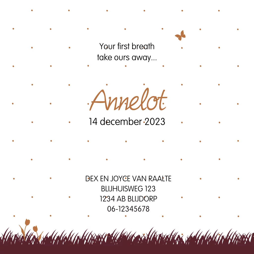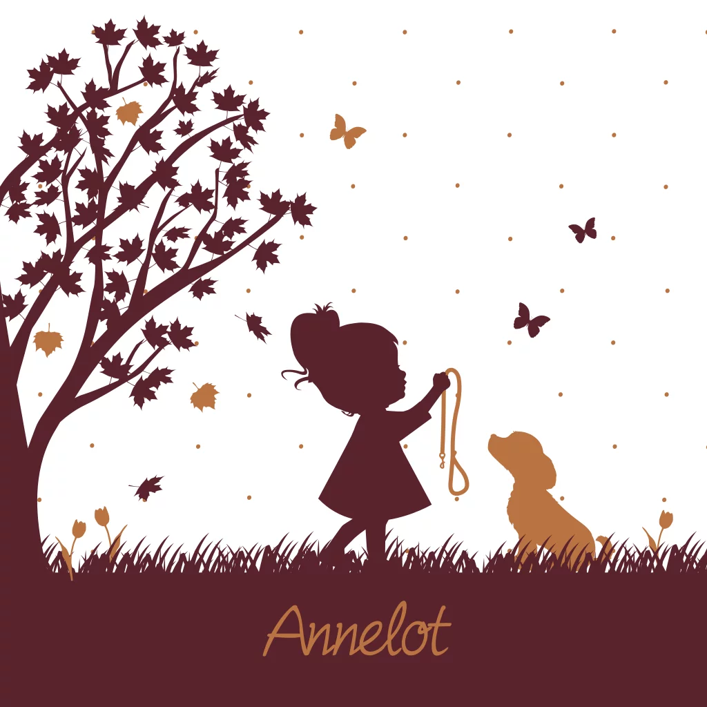 Silhouet geboortekaartje met daarop een meisje met een hondje. Door de herfsttinten op deze kaart is dit kaartje ook goed te gebruiken voor herfstkindjes. Een speels kaartje met verder erop verwerkt een boom, bloemetjes en een stipjes patroon op de achtergrond.