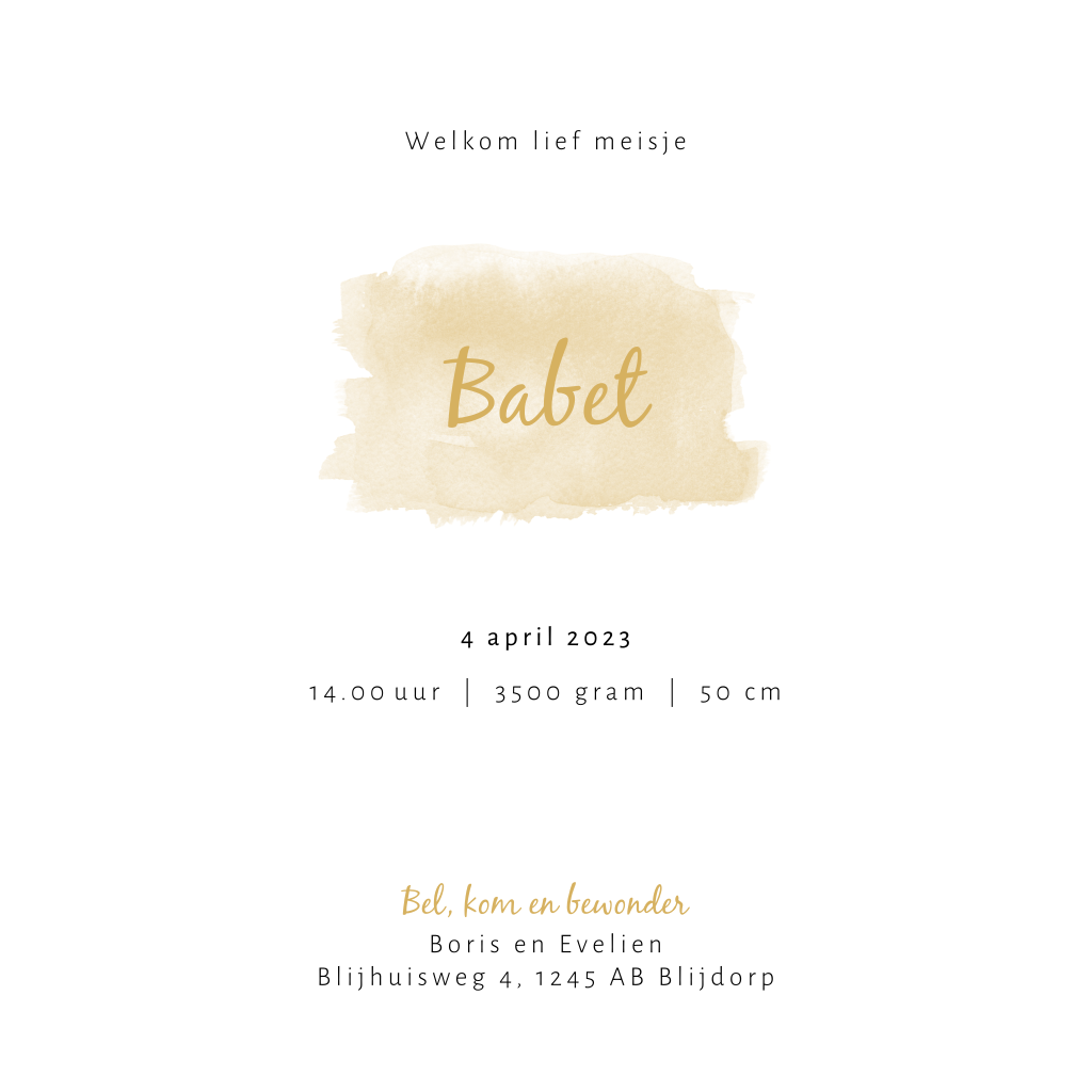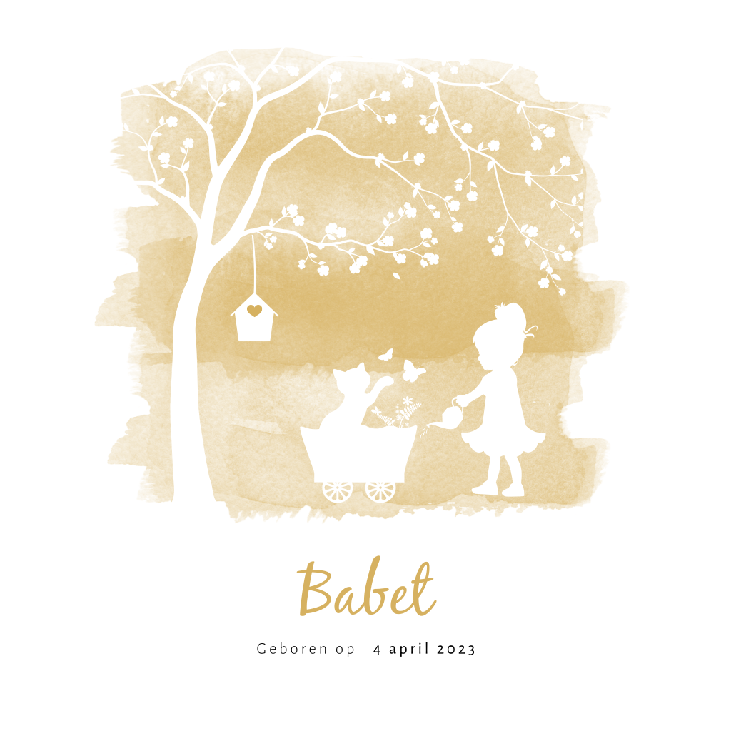 Silhouet geboortekaartje voor een dochter. Op dit kaartje Babet staat een meisje met een gieter die de bloemetjes water geeft. Naast haar een karretje waarin een poesje zit. Op de achtergrond van dit kaartje een aquarel, boom en een vogelhuisje. Teksten en kleuren, evenals het silhouet, zijn aan te passen in de editor.