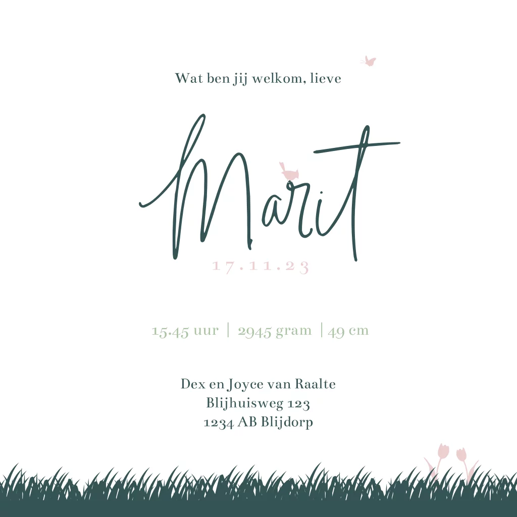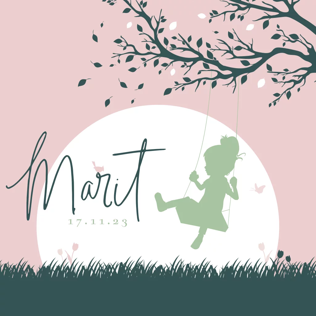 Lief silhouet geboortekaartje voor een dochter. Op dit kaartje Marit staat een meisje op de schommel in een trendy kleuren combinatie. Kleuren en teksten, evenals het silhouet zijn aan te passen in de editor.