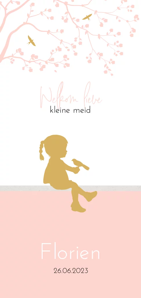 Lief silhouet geboortekaartje met een zittend meisje met een vogeltje op haar hand. Op dit kaartje Florien is pastel roze gecombineerd met goudkleur, wit en een klein randje grijs karton look.