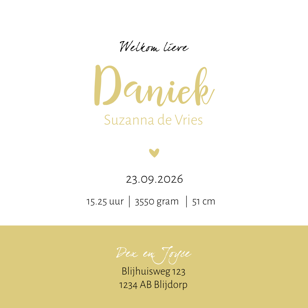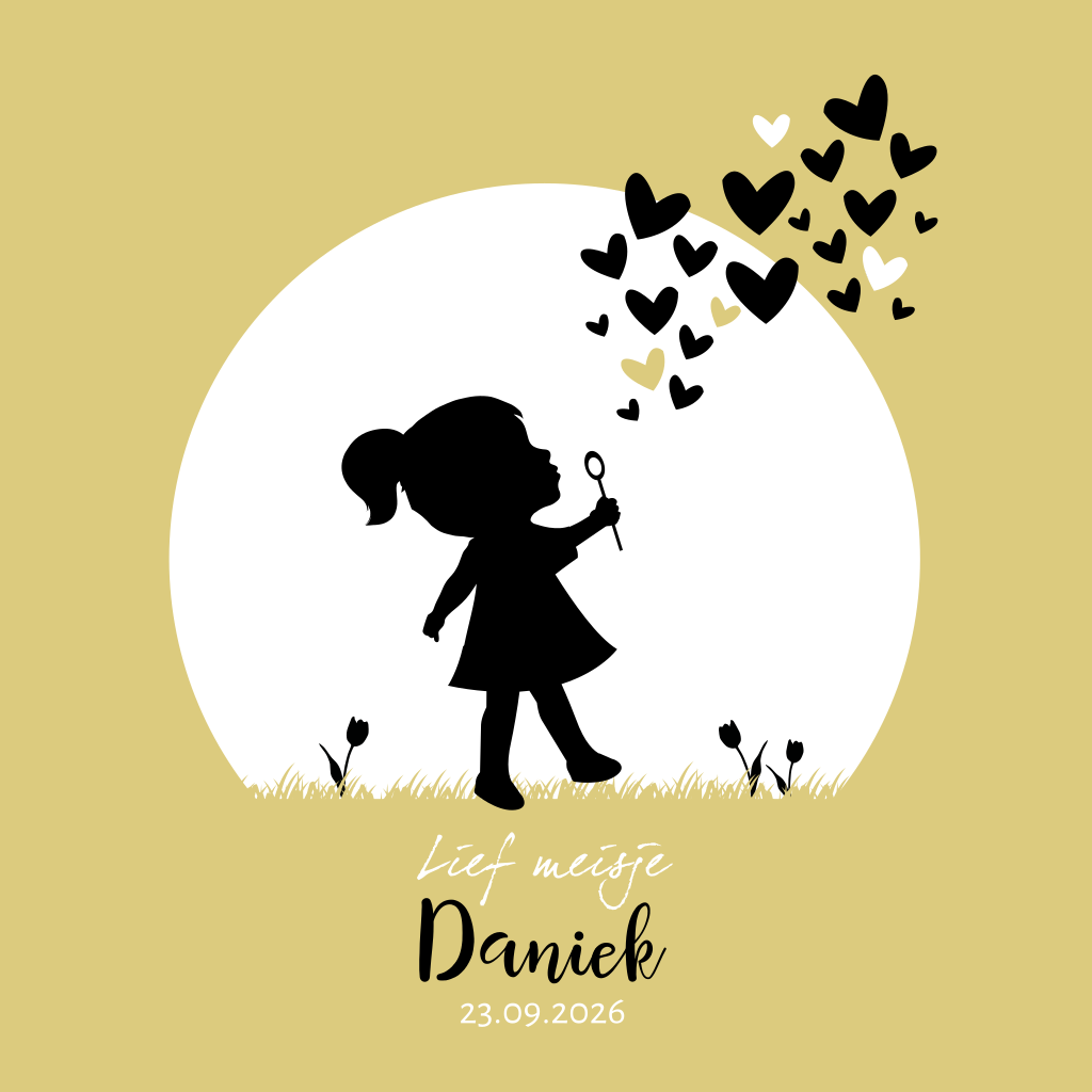 Mooi silhouet geboortekaartje met een meisje en hartjes bellenblaas. Het silhouetje staat in een cirkel en de hartjes dwarrelen over deze cirkel heen. Voor dit babykaartje hebben we gekozen voor de kleuren combinatie zacht geel zwart.