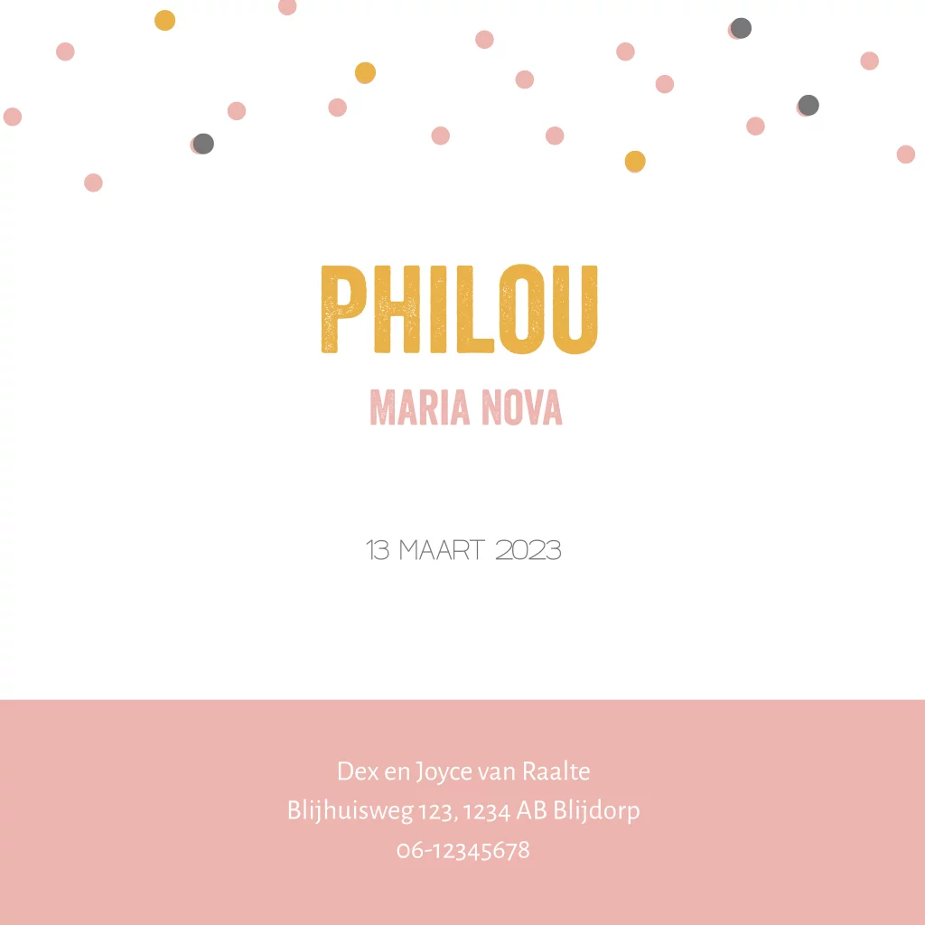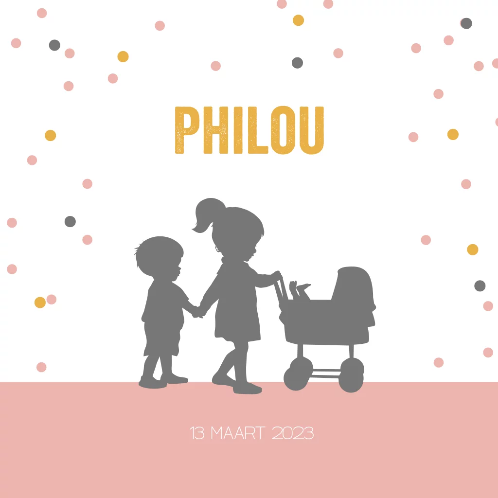 Derde kindje op komst? Dit broertje en zusje geboortekaartje vormt de perfecte aankondiging voor een baby zusje. De confetti en de frisse kleuren geven de kaart een hippe uitstraling. Het lieve tafereeltje met drie kindjes (een grote zus, broer en een baby) is, evenals de kleurencombinatie, naar je eigen persoonlijke situatie aan te passen.