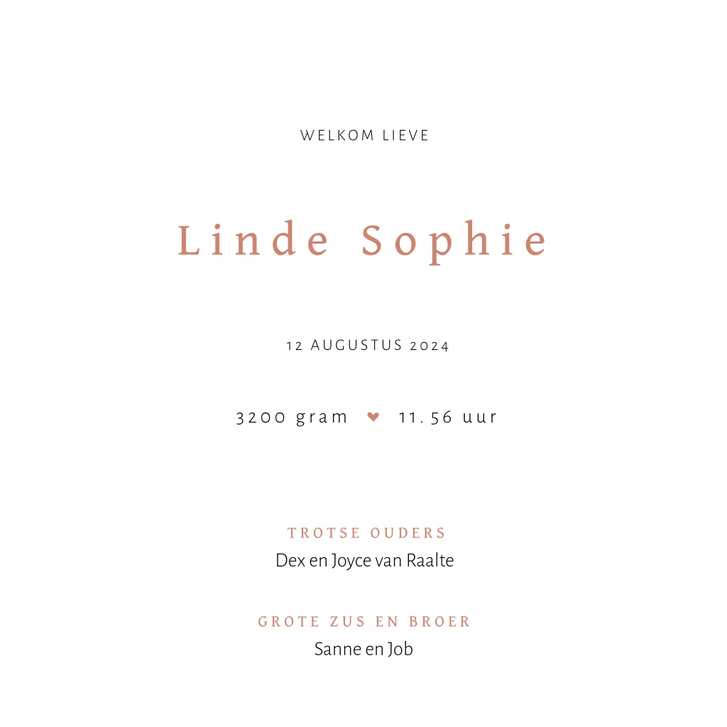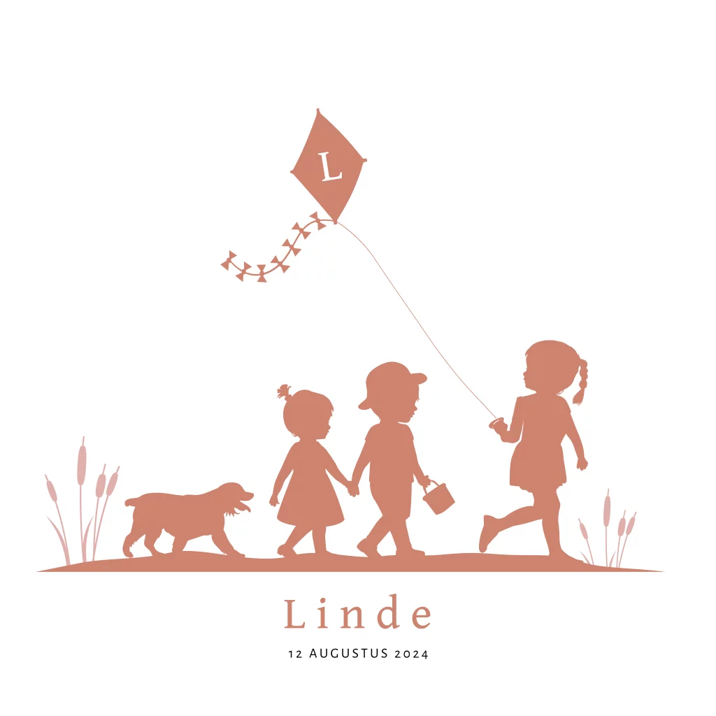 Vrolijk en zomers babykaartje voor een zusje met de silhouetten van 3 kindjes en een hond. Het kleine zusje loopt hand in hand met een grote broer, die een zomerhoedje en een emmertje draagt. De grootste zus heeft een vlieger in haar hand. Dit geboortekaartje Linde is overwegend wit met de silhouetten in trendy terra. Pas deze kaart naar je eigen smaak aan. Ook mogelijk met andere silhouetten.