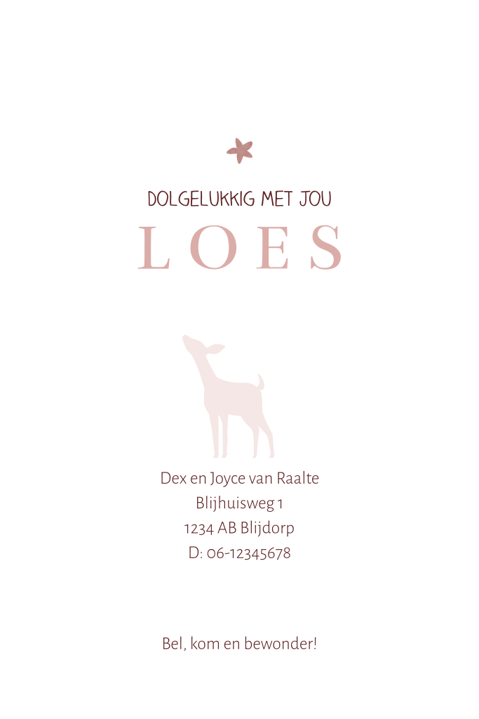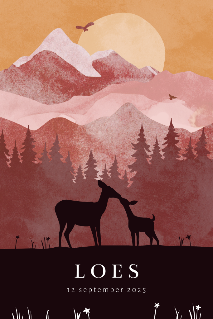Geboortekaartje voor een dochter met twee silhouetjes van hertjes. Op de achtergrond bergen in aquarel, dennenbomen, vogels en een ondergaande zon. De donkere, zwarte silhouetjes laten het avond lijken. Liever andere kleuren, teksten of afbeeldingen? Dit meisjes babykaartje Loes pas je eenvoudig aan in onze editor.