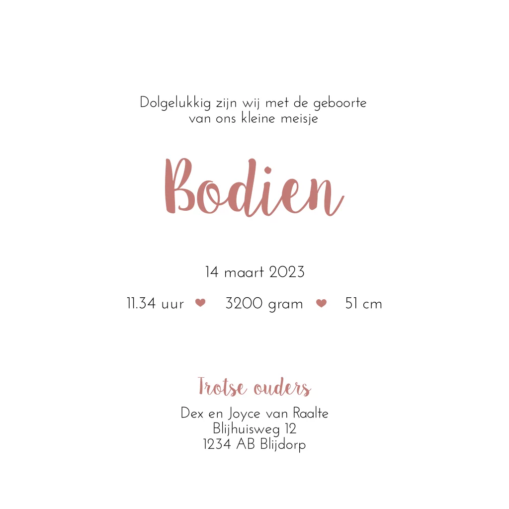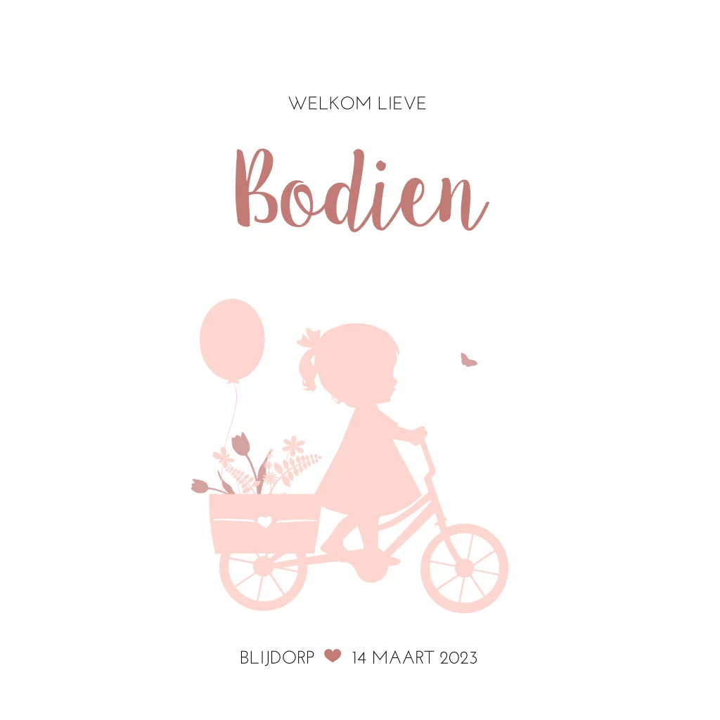 Lief silhouet geboortekaartje met een meisje op een fiets. Achterop de fiets zit een bakje gevuld met bloemen, tulpen en een ballon. Dit kaartje Bodien is overwegend wit en oogt daardoor clean. Kleuren en lettertypes zijn aan te passen in de editor.