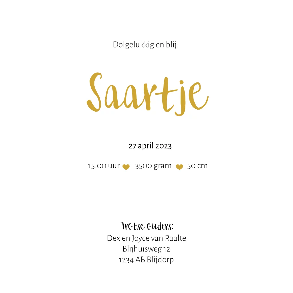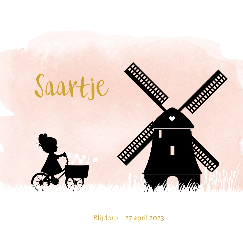 Hollands silhouet geboortekaartje voor een dochter. Op dit kaartje Saartje staat een meisje op de fiets met tulpen voorin haar bakje en een Hollandse molen. De teksten en kleuren zijn naar wens aan te passen in de editor. Ook pas je met een paar klikken het silhouet aan of voeg je nog andere afbeeldingen toe.