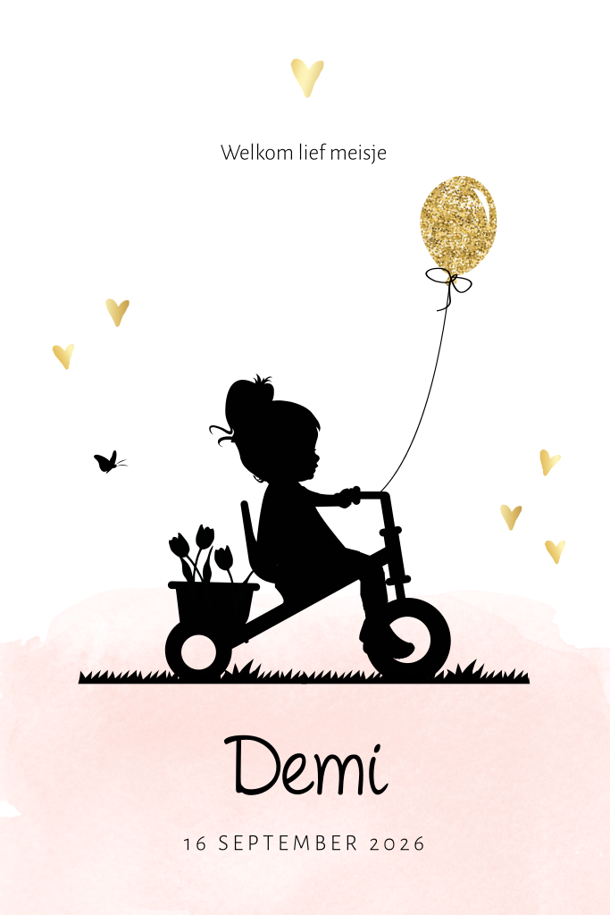 Lief silhouet meisjeskaartje met een roze aquarel. Op dit kaartje staat een silhouet van een meisje fietsend op een driewieler met tulpen achterin het bakje. Een schattig tafereeltje! Op de kaart met de babynaam Demi staan enkele goudkleurige elementen, waaronder een ballon en hartjes.