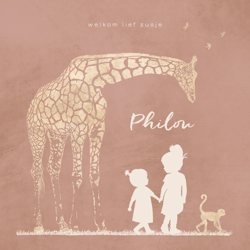 Dieren geboortekaartje voor een dochter: een zusje. Op dit silhouet babykaartje Philou een giraf die boven de twee zusjes staat. Grote zus en haar kleine zusje wandelen hand in hand met een klein aapje er naast. De ruwe roestbruine achtergrond geeft dit kaartje een stoere uitstraling.