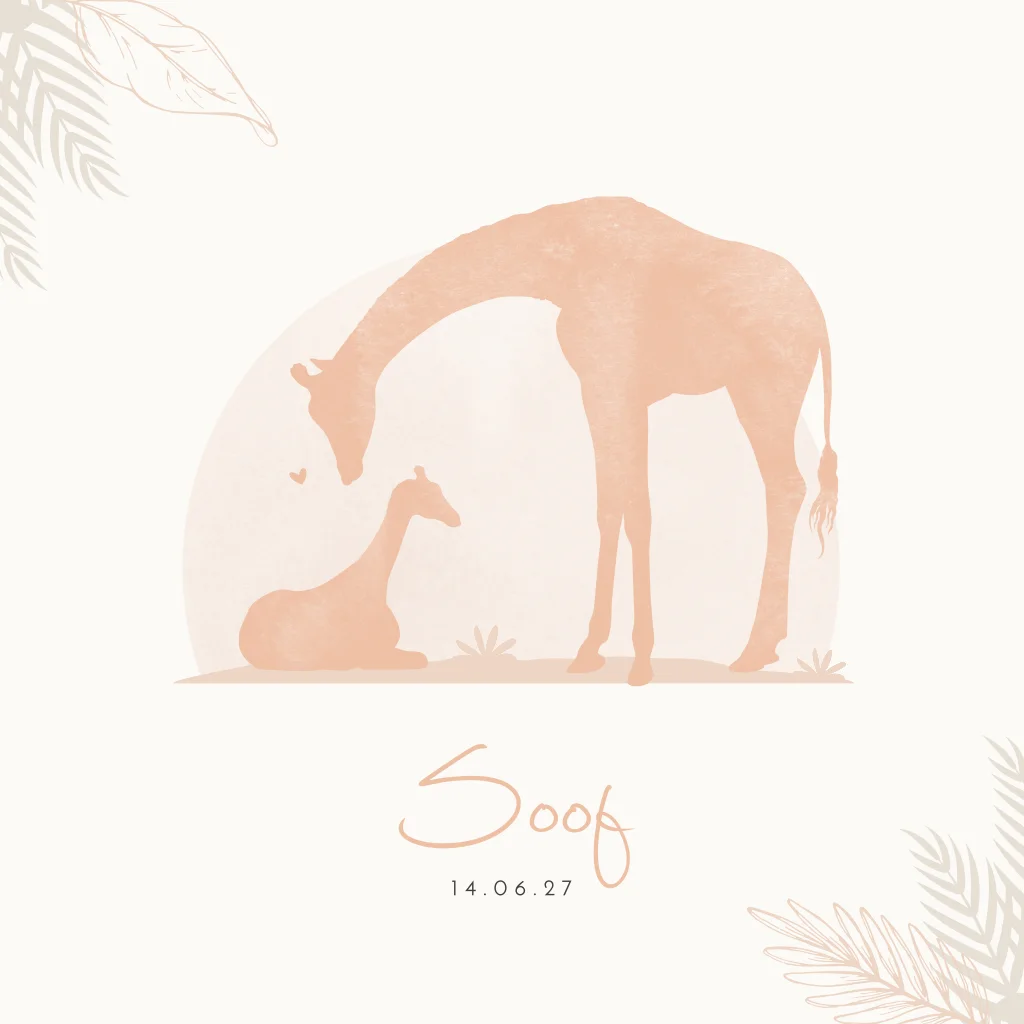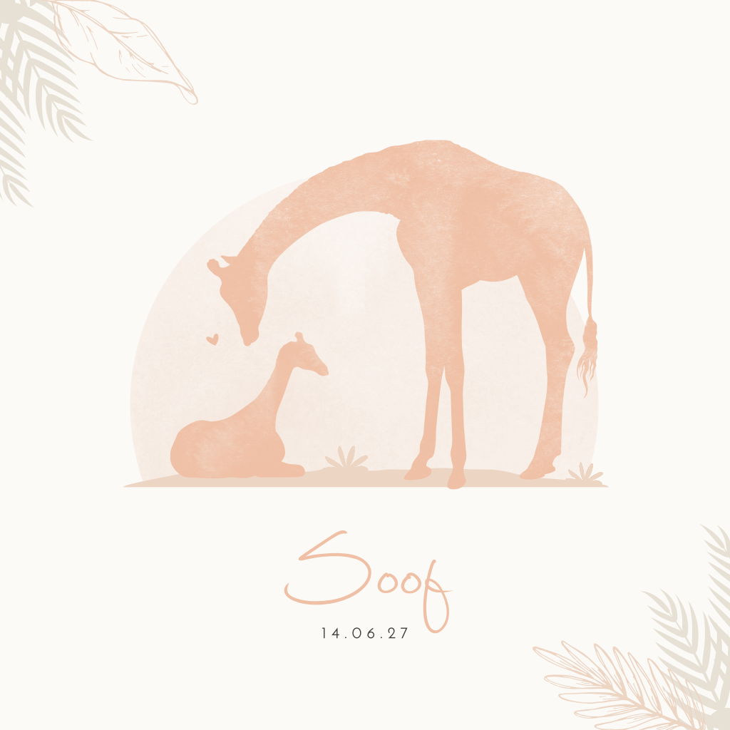 Geboortekaartje met silhouet en ronde hoeken voor een dochter. Op dit dierenkaartje Soof zie je een moeder giraffe met een klein baby girafje. De silhouetjes hebben een roze kleur. Op de achtergrond een beige kleur met botanische palmbladeren en de zon. Dit geboortekaartje voor een meisje heeft mooie zachte beige met roze kleuren. De ronde hoeken geven het kaartje een speels effect. Pas dit geboortekaartje geheel naar eigen wens aan in de editor. Hulp nodig? Wij helpen je graag!