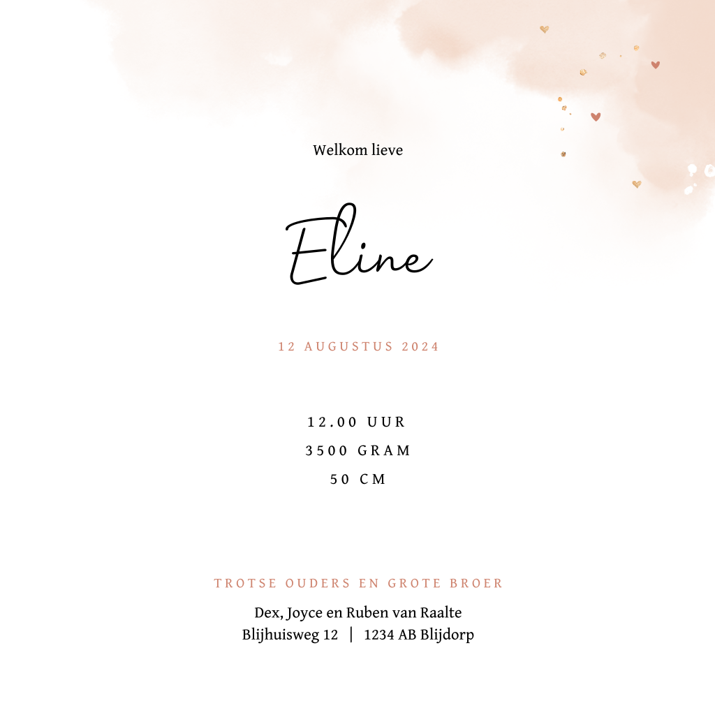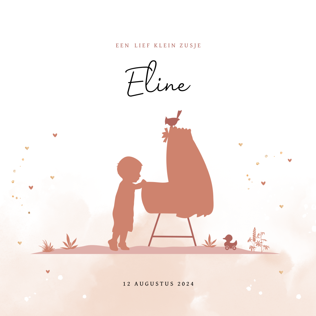 Hip silhouet geboortekaartje voor een tweede kindje, een dochter. Op dit meisjeskaartje Eline kijkt een grote broer over het randje van de wieg naar zijn kleine baby zusje. Op de achtergrond roze watercolor en kleine hartjes. Teksten en lettertypes zijn aan te passen in de editor. Ook mogelijk voor een andere gezinssamenstelling.