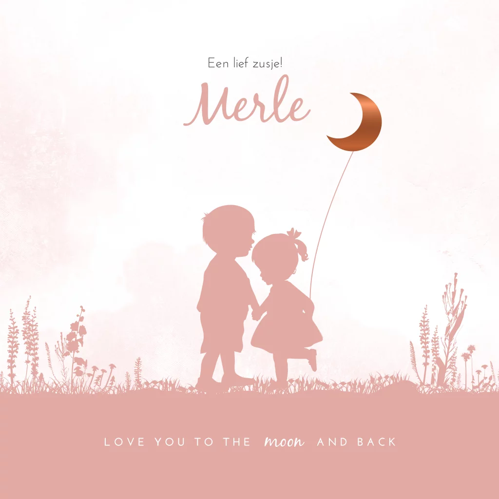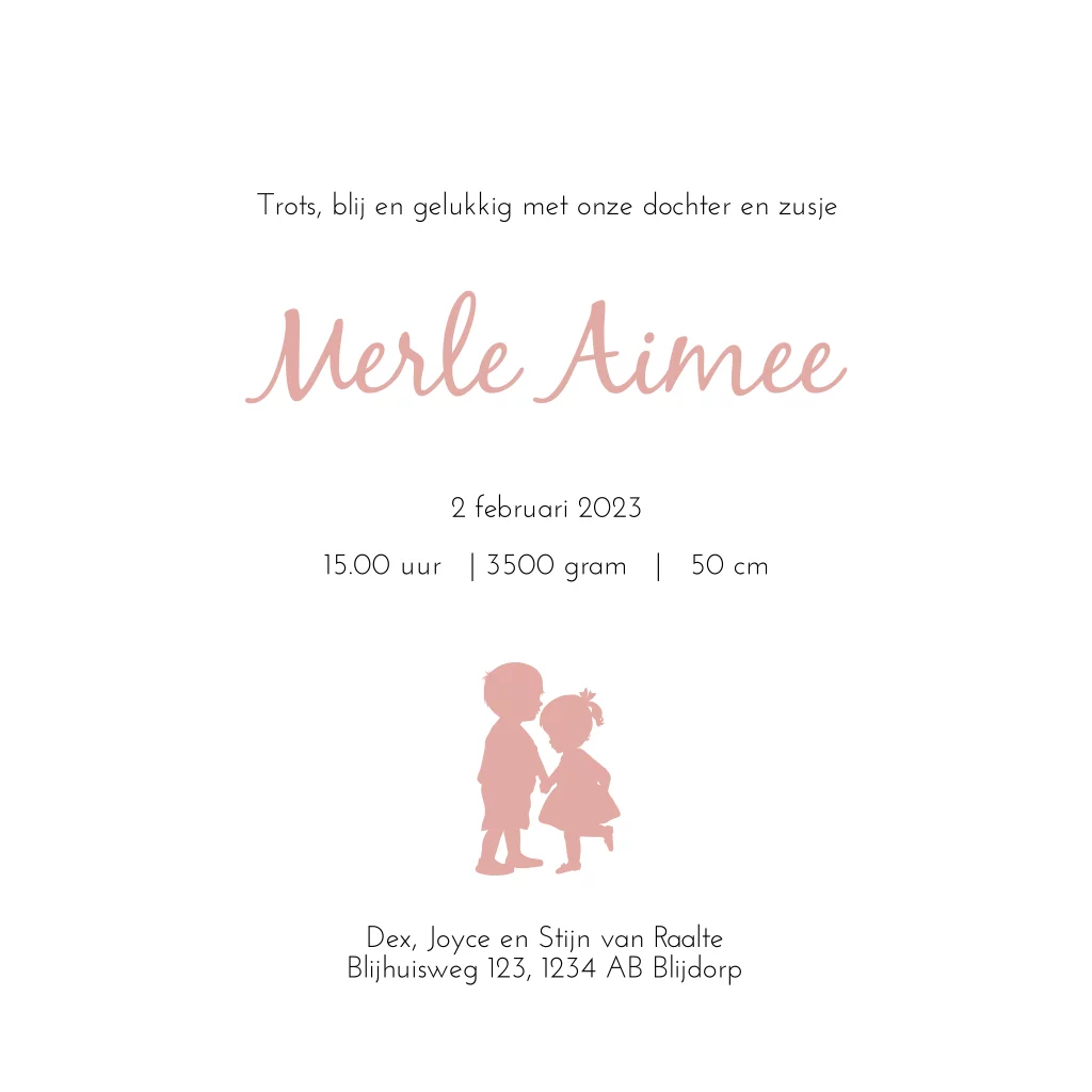 Silhouet geboortekaartje voor een tweede kindje, een grote broer met een klein baby zusje. Op dit babykaartje Merle geeft een grote broer zijn kleine zusje een kusje. Teksten en kleuren zijn aan te passen inn de editor.