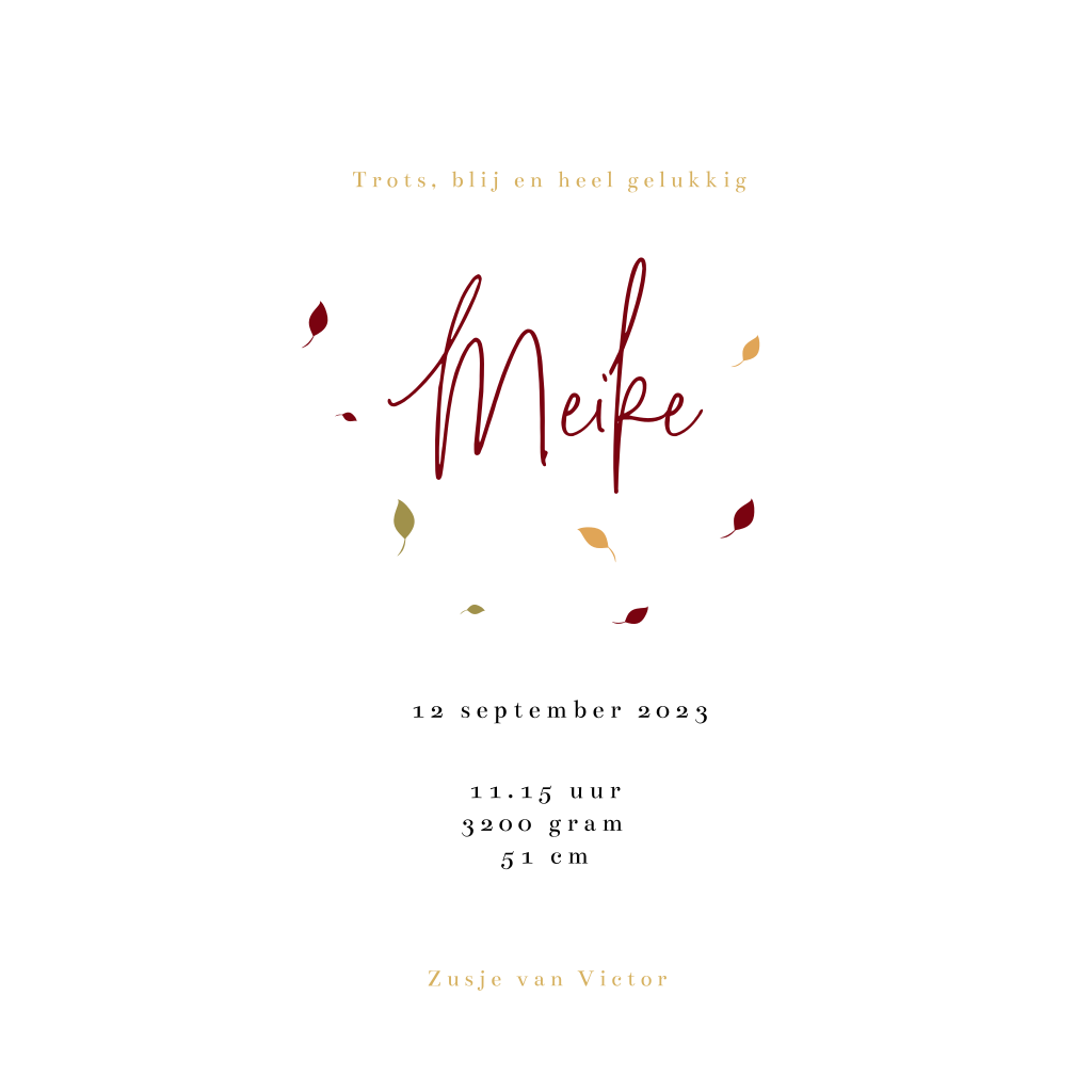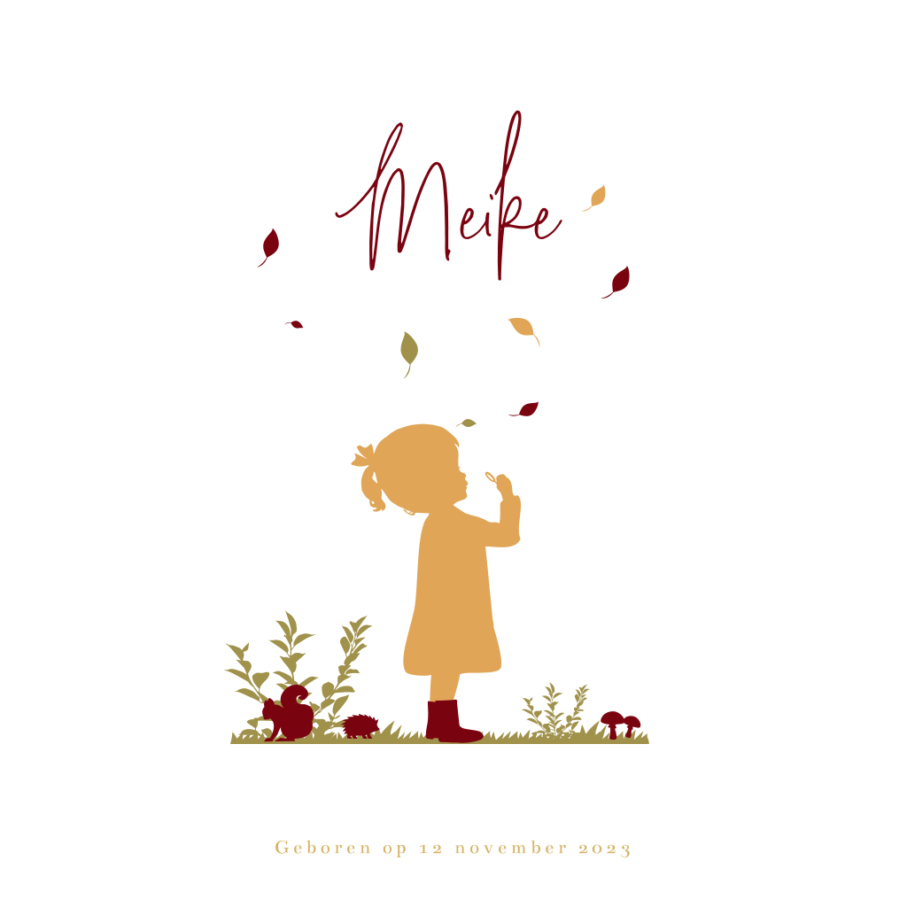 Silhouet geboortekaartje in herfst thema voor een meisje. Op dit kaartje Meike staat een meisje met laarsjes aan die met haar bellenblaas kleine blaadjes rond laat dwarrelen. Verder staan er op dit kaartje een egeltje, eekhoorn en kleine paddenstoeltjes. De kleuren en teksten zijn gemakkelijk aan te passen.