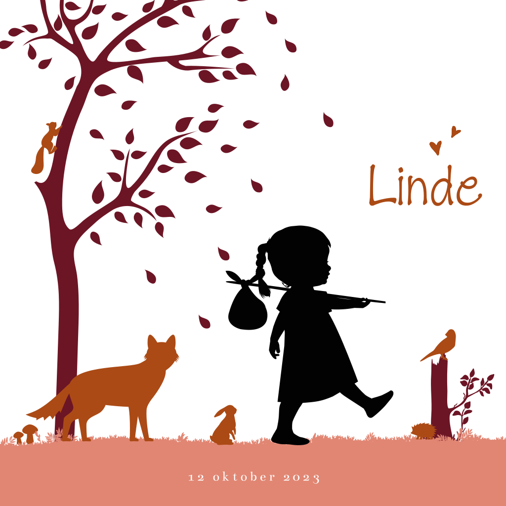 Herfst geboortekaartje met het silhouet van een klein meisje met een knapzak die aan het wandelen is in het bos. Om haar heen verschillende bos dieren, waaronder een vosje, konijn, eekhoorn, egeltje en een vogeltje. De teksten en kleuren van dit kaartje Linde zijn aan te passen in de editor. Ook mogelijk met een ander silhouet.