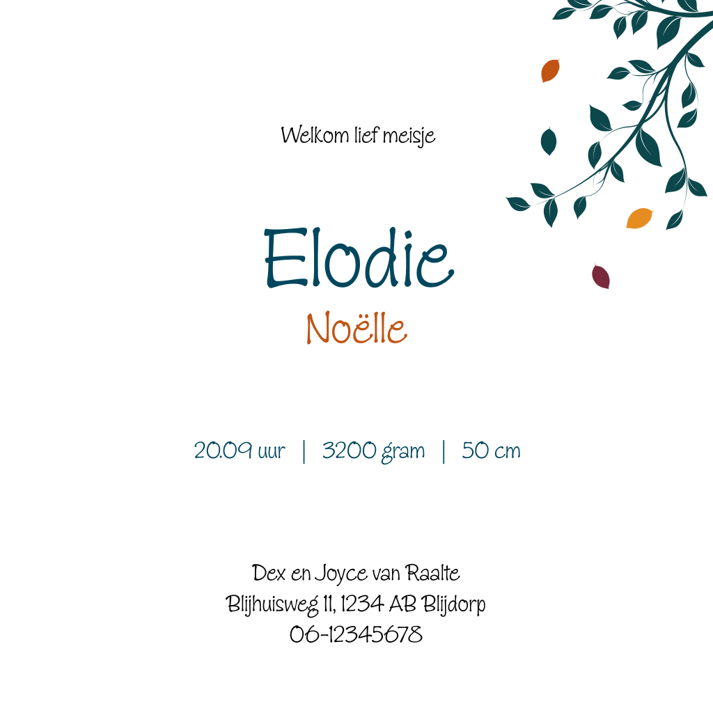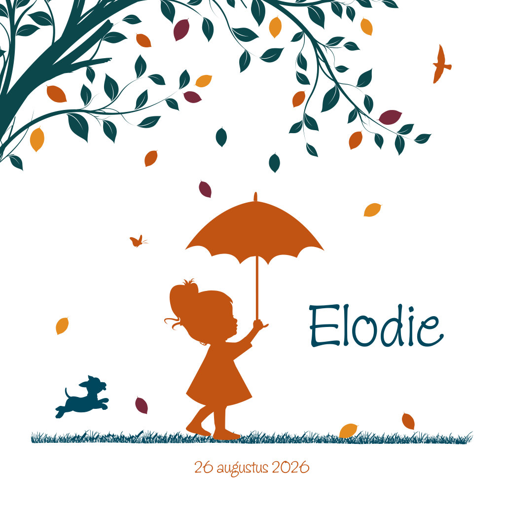 Hip silhouet geboortekaartje in herfst thema voor een meisje. Op dit kaartje Elodie staat een meisje met een paraplu. De blaadjes dwarrelen van de boom naar beneden. Verder staan er op dit kaartje een vrolijk hondje, vogel en vlindertje. De kleuren en teksten zijn gemakkelijk aan te passen.