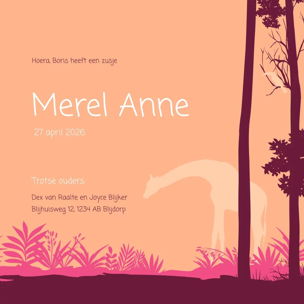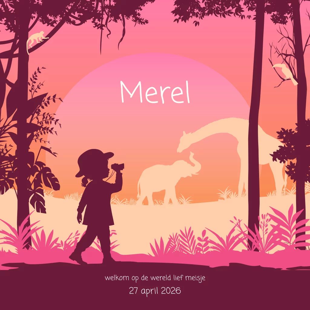 Kleurrijk silhouet geboortekaartje voor een dochter in trendy felle kleuren. Dit kaartje Merel heeft een jungle thema met silhouetten van een meisje met verrekijker, een olifant, giraffe en toekan. Op de achtergrond tropische bomen. Teksten, kleuren en de silhouetten kun je gemakkelijk aanpassen in de editor.