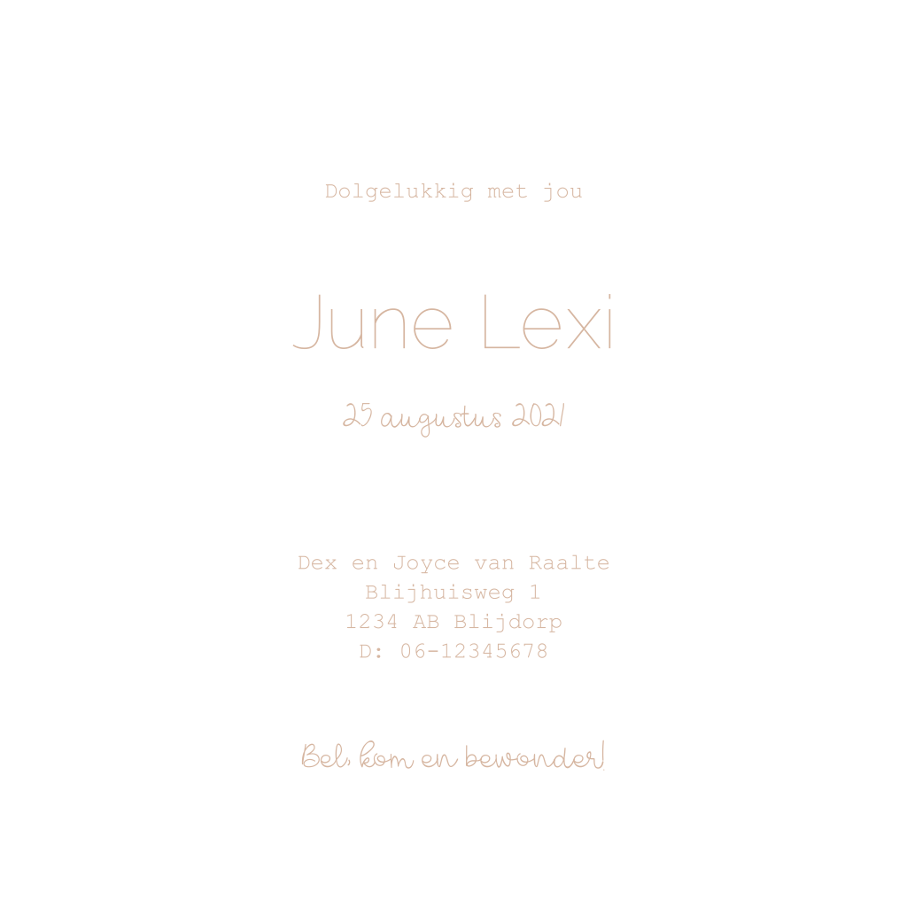Jungle silhouet geboortekaartje met giraffe voor een dochter. Op dit kaartje een silhouet van een meisje op safari met tropenhoed en verrekijker. Voor dit kaartje June zijn zachte warme aardetinten gebruikt. Wil je liever andere kleuren, dan kun je dit aanpassen in de editor. Ook mogelijk met een ander silhouet of voor een andere gezinssamenstelling.