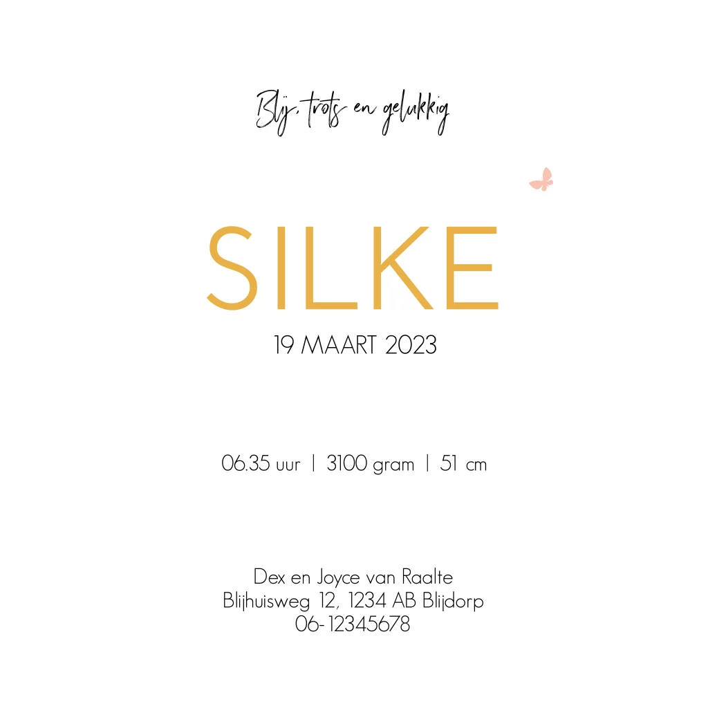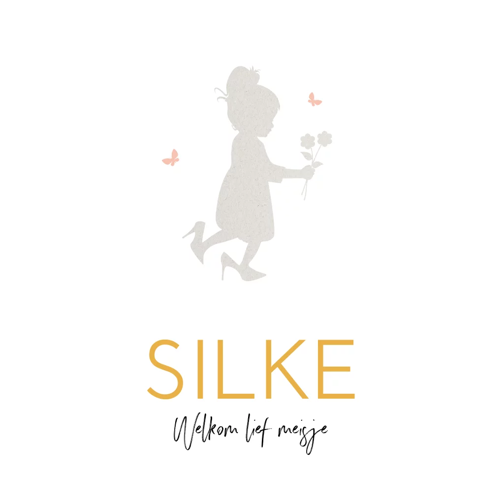 Silhouet geboortekaartje van een meisje op hoge hakken met bloemetjes in haar hand. De kartonnen achtergrond van het geboortekaartje geven een mooi contrast met de kleuren wit en rood. Enkele subtiele hartjes maken het kaartje helemaal af.