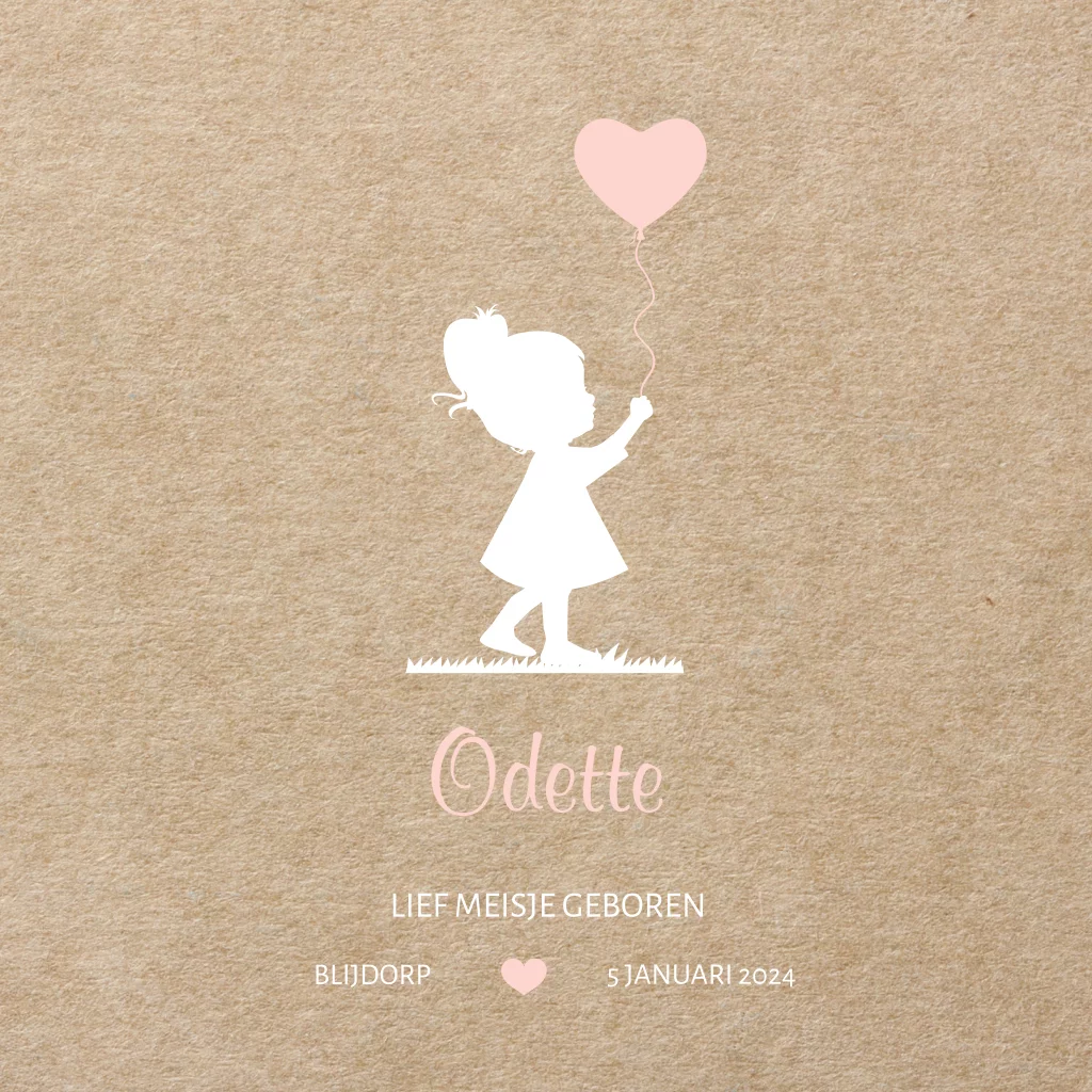 Een rustig silhouet geboortekaartje voor een meisje op een kartonnen achtergrond. Op dit silhouet kaartje Odette staat een meisje met een hartjesballon. Deze baby kaart is eenvoudig aan te passen.