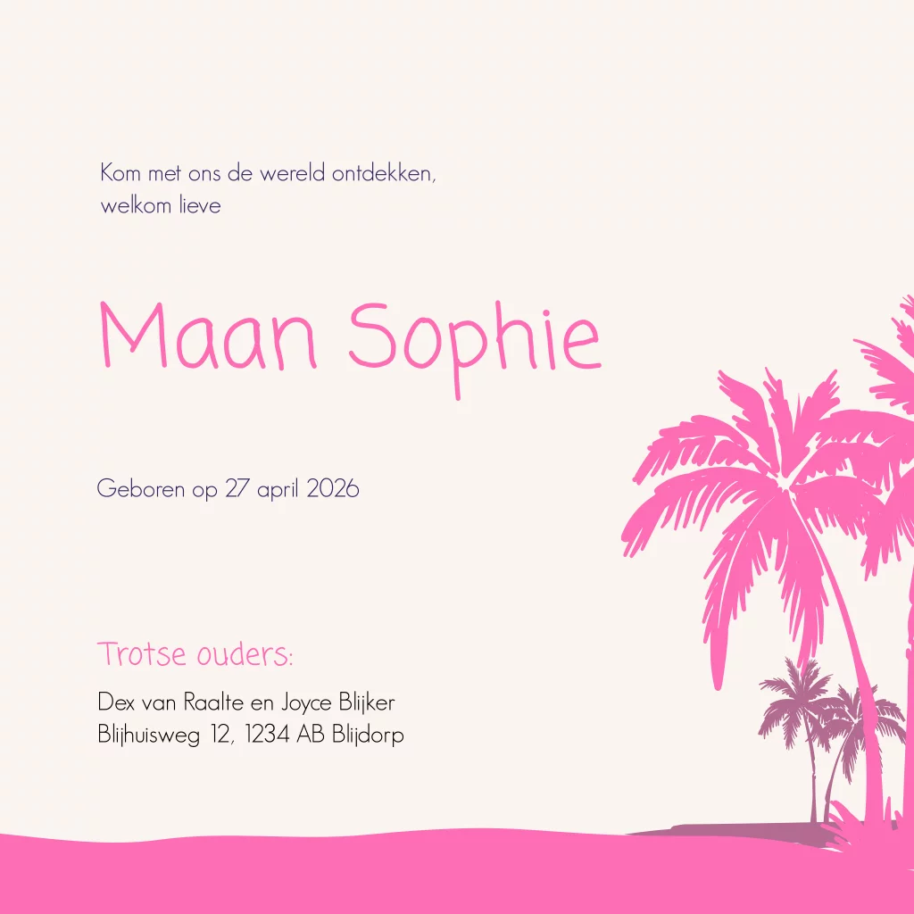 Silhouet geboortekaartje voor een derde kindje met felle roze en paarse kleuren, helemaal de trend van nu. Op dit meisjeskaartje met de babynaam Maan staan 2 grote broers hand in hand met een klein zusje op het strand met tropische palmbomen. Teksten, kleuren en de silhouetten kun je aanpassen in de editor.