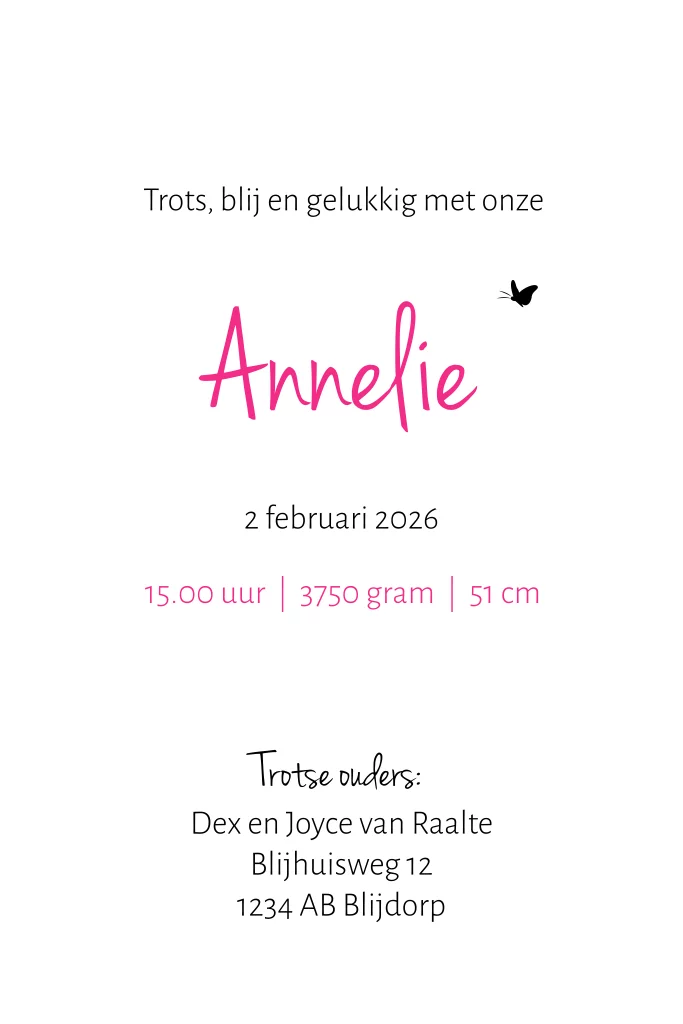 Hip silhouet geboortekaartje met een groot hart en een karton achtergrond. Een mooie combinatie met de afbeeldingen en teksten in de kleur zwart met wit en knal roze accenten. Op dit babykaartje Annelie staat een meisje in het gras met een kar vol met bloemetjes.