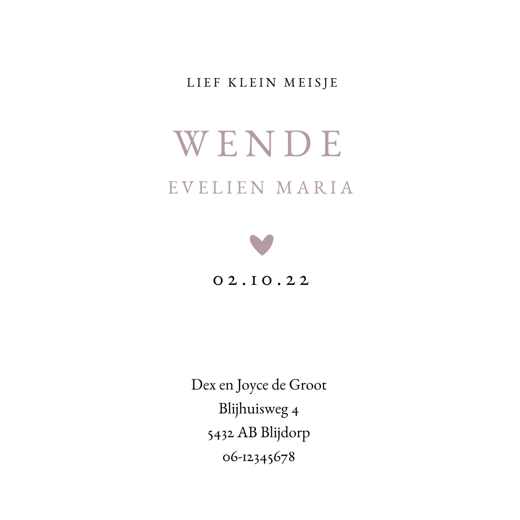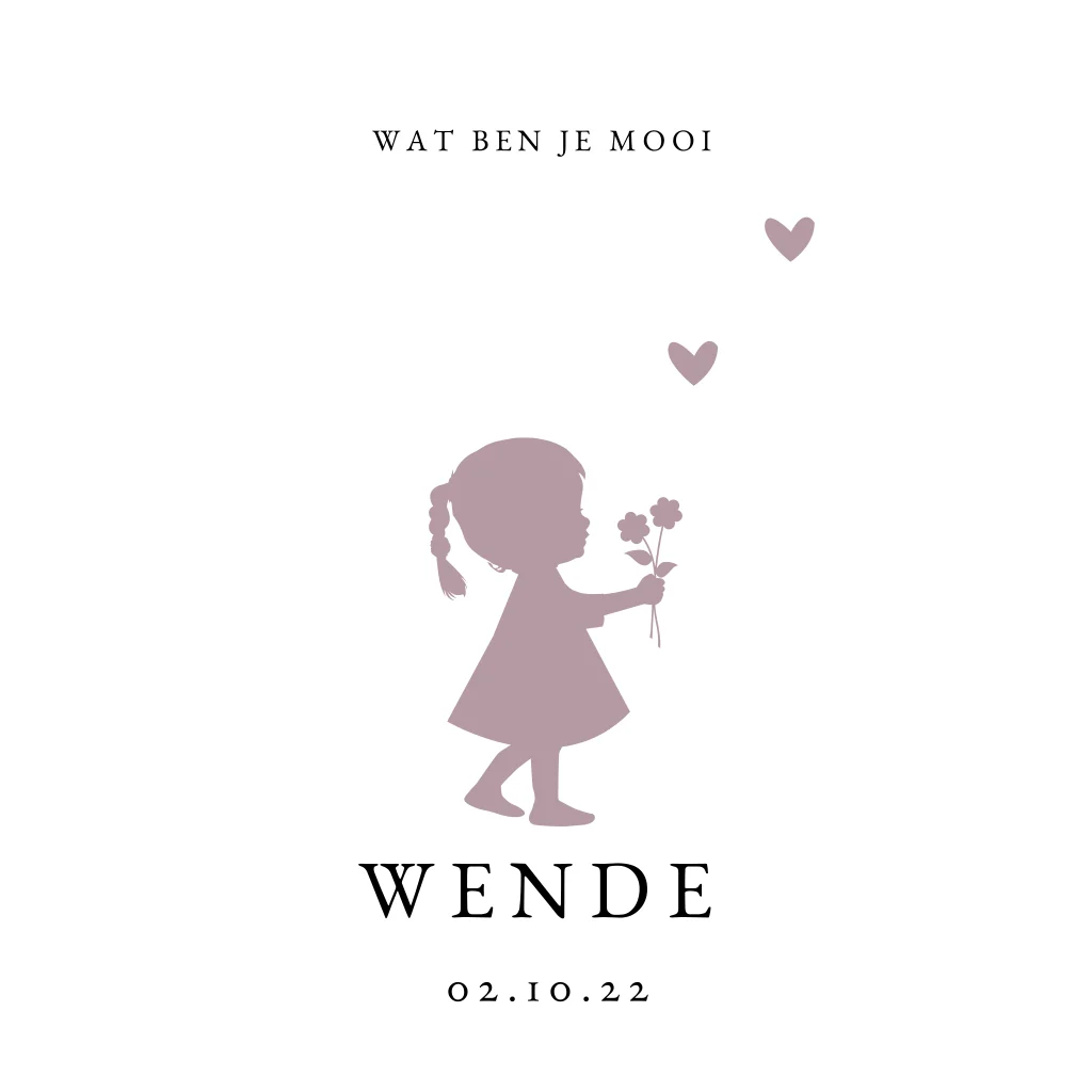 Lief silhouet geboortekaartje voor een meisje. Het lieve meisje op de voorkant van de kaart heeft bloempjes in de hand en de kleur van het silhouet is helemaal hip.
