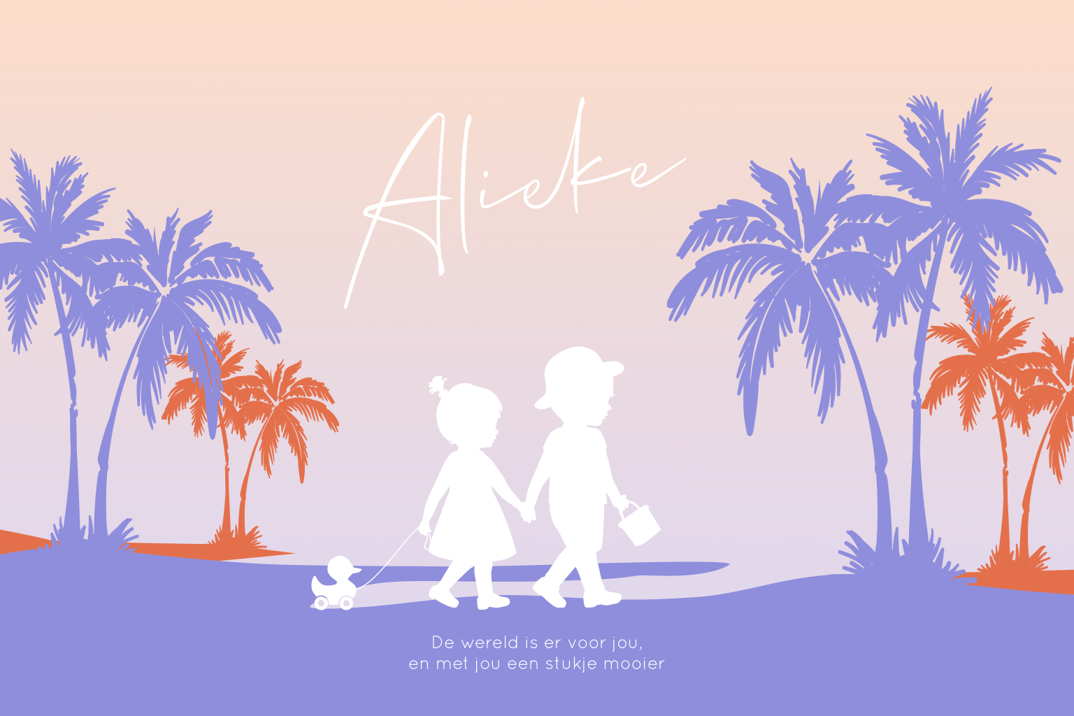 Zomers silhouet geboortekaartje in felle kleuren voor een tweede kindje, een zusje. Op dit babykaartje Alieke een grote broer met een klein zusje op een palmenstrand. Teksten, kleuren en de silhouetten kun je gemakkelijk aanpassen in de editor.