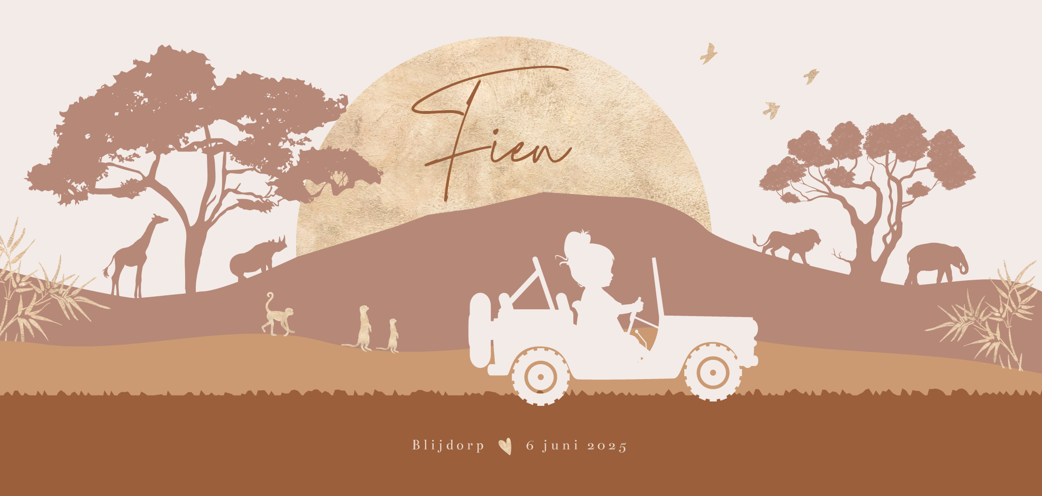 Silhouet geboortekaartje in jungle thema met een meisje in een jeep en verschillende safari dieren. Op dit meisjeskaartje Fien staan o.a. een giraffe, leeuw, olifant en een aapje. Op de achtergrond bomen en een heuvelachtig landschap. De babynaam staat in een goudkleurige ondergaande zon. Teksten, kleuren en de silhouetten kun je gemakkelijk aanpassen in de editor. Dit silhouet geboortekaartje is ook mogelijk voor een andere gezinssamenstelling.