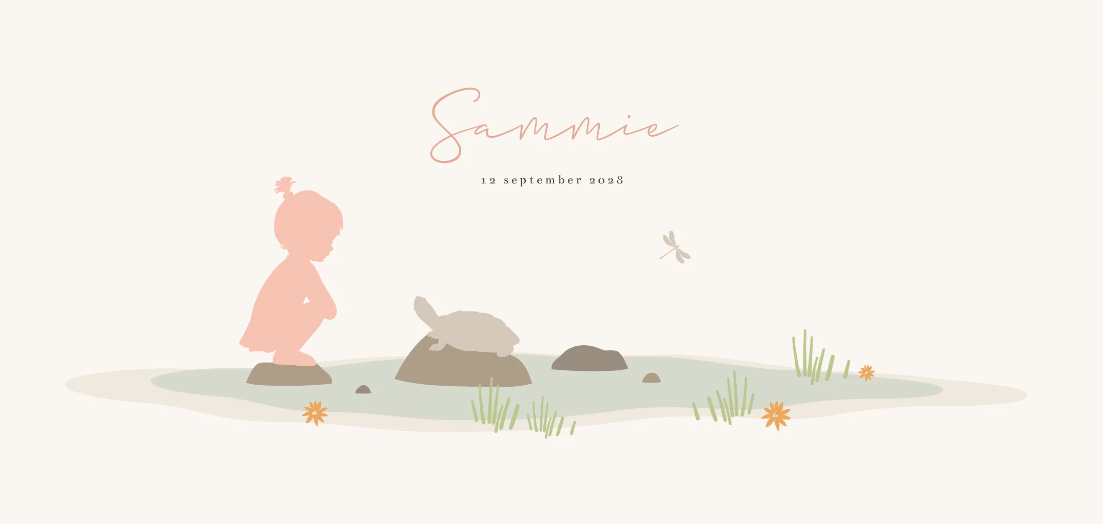 Dit geboortekaartje voor een meisje met een schildpad en vijver zijn perfect voor baby's die in de lente geboren worden. Je ziet op dit geboortekaartje Sammie een silhouet van een meisje, hurkend op een steen. De kaart heeft pastelkleuren wat perfect past bij het voorjaar. Dit geboortekaartje kun je naar eigen smaak aanpassen in de editor. Hulp nodig? We helpen graag!
