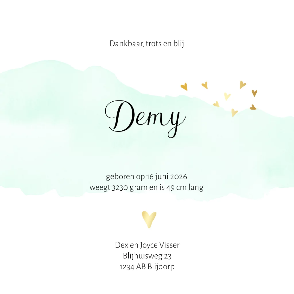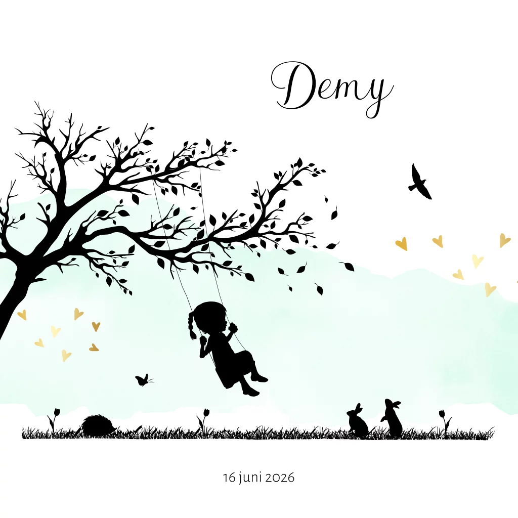 Lief meisjes geboortekaartje met silhouet en aquarel. De blauwgroene watercolor achtergrond bij het zwarte silhouet van een meisje op een schommel is een mooie combinatie. De goudkleurige hartjes maken dit babykaartje Demy helemaal af.