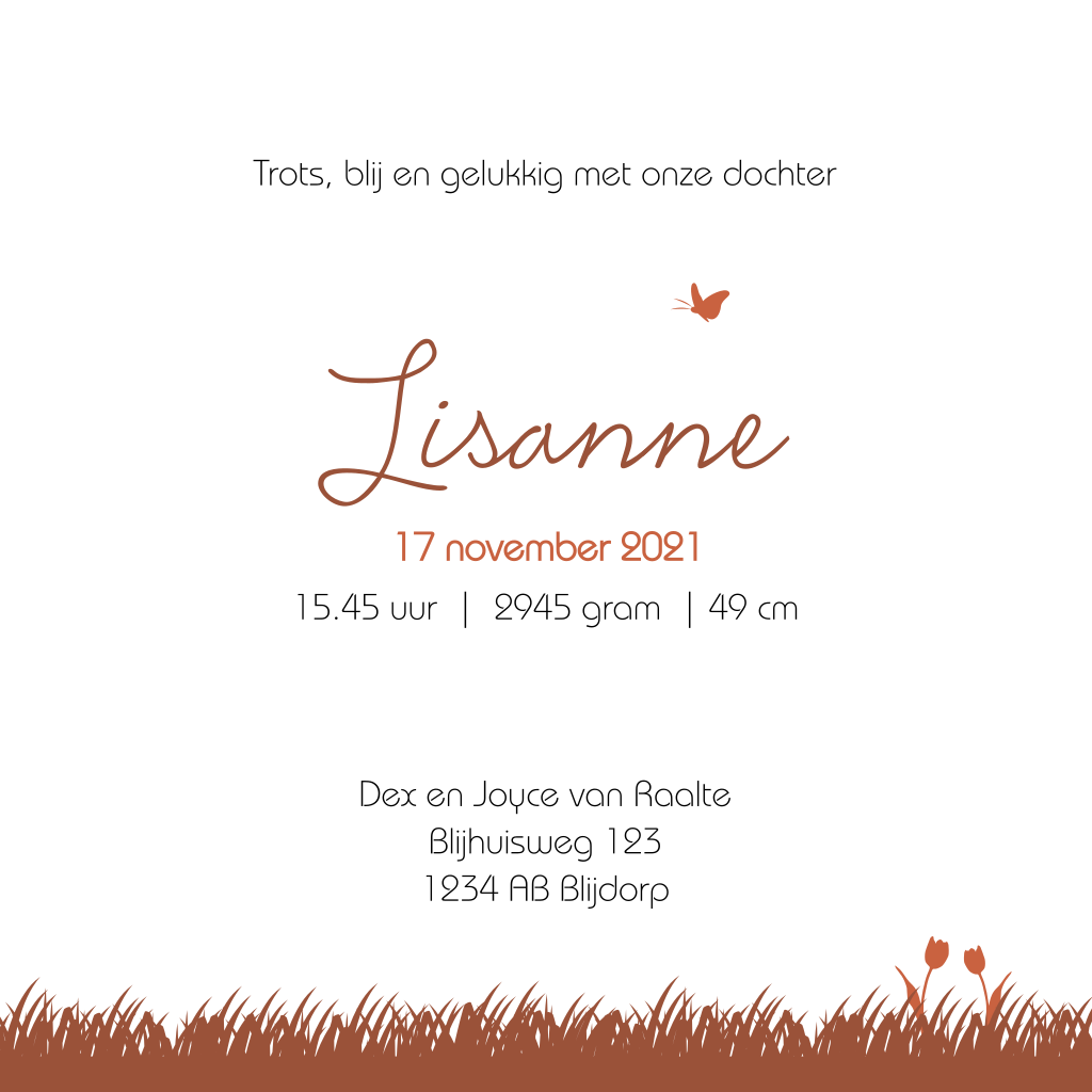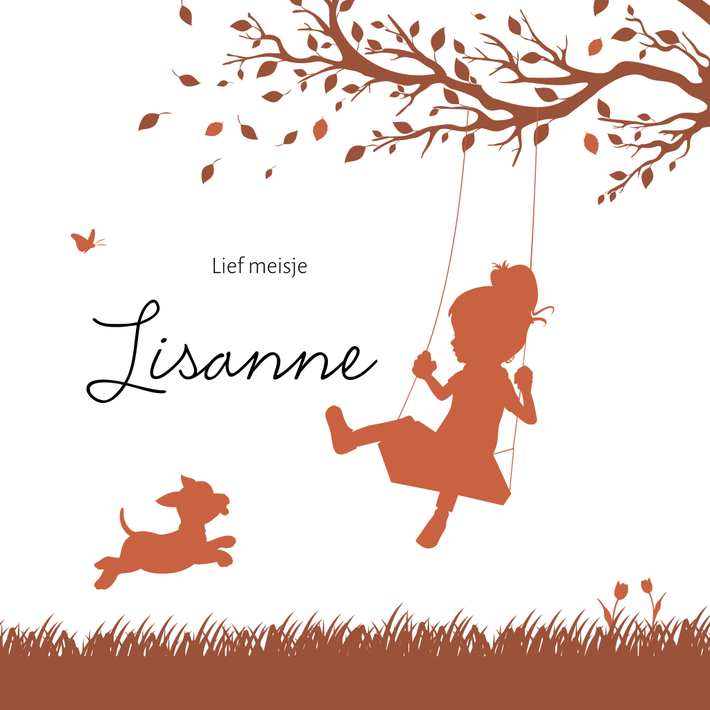 Silhouet geboortekaartje voor een dochter. Op dit kaartje Lisanne zie je een meisje schommelend aan een boomtak en een hondje. Op dit vrolijke kaartje zijn hippe roest bruine kleuren gebruikt. De kleuren zijn aan te passen. Ook is dit kaartje aan te passen naar een andere gezinssamenstelling.
