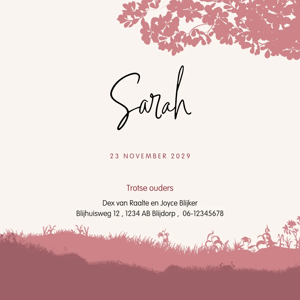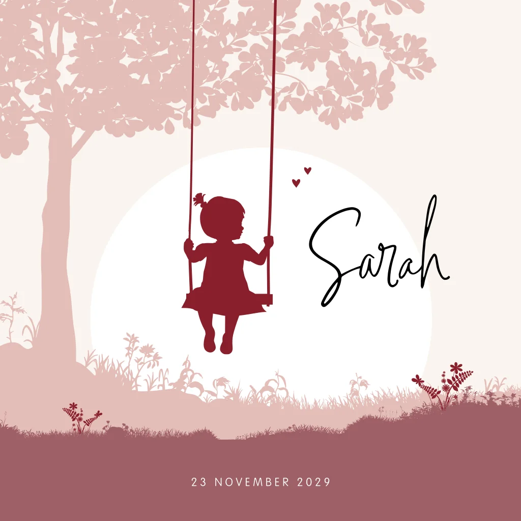 Silhouet geboortekaartje voor een dochter. Op dit meisjeskaartje Sarah een silhouet van een meisje op een schommel. Op de achtergrond een paars/roze ton sur ton landschap met boom, bloemetjes en ondergaande zon. Dit kaartje is hierdoor helemaal geschikt voor een lente of zomer baby!