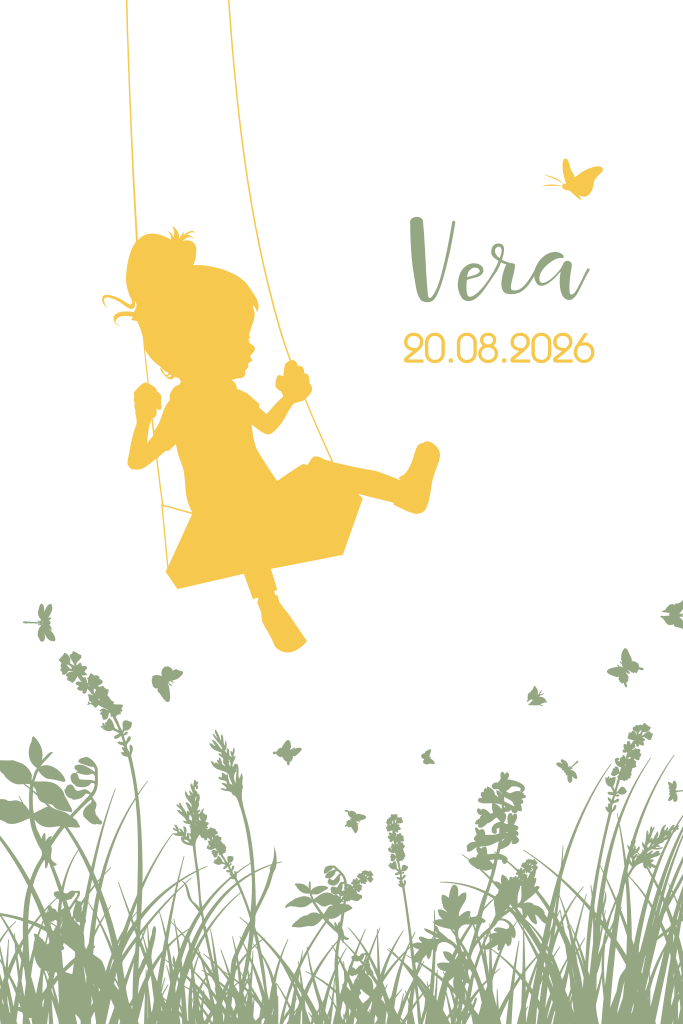 Silhouet geboortekaartje van een meisje op de schommel. Het hoge gras en de vlinders geven dit kaartje een speelse uitstraling. De kaart heeft een witte achtergrond, gecombineerd met olijf groene en gele kleuren.
