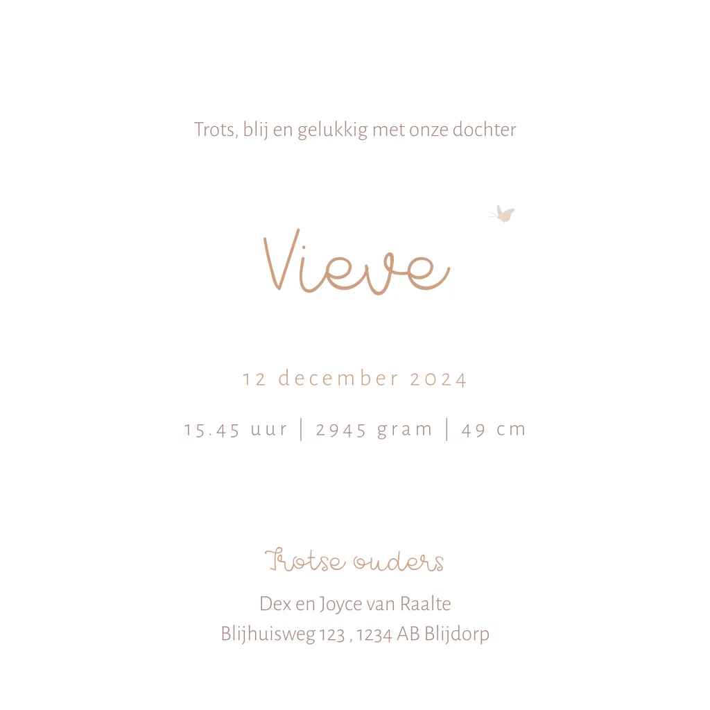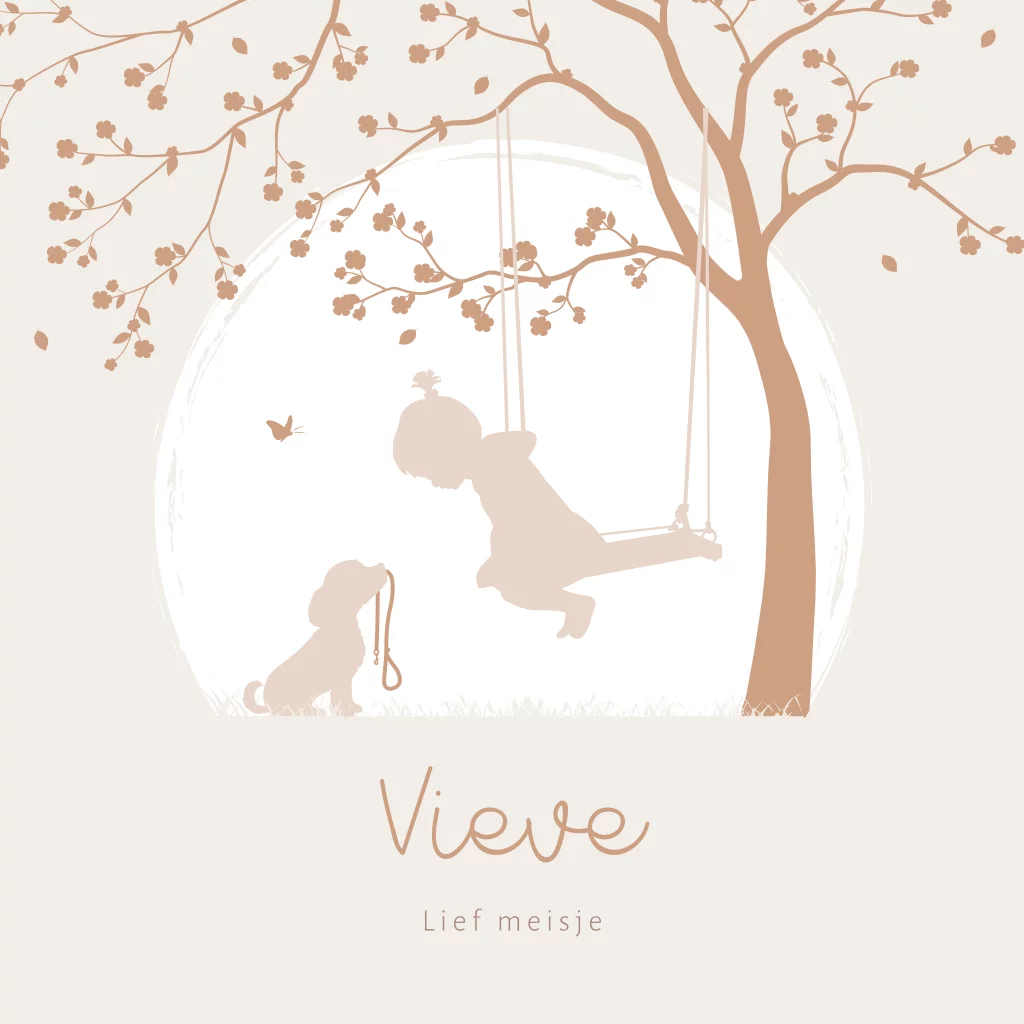 Silhouet geboortekaartje met een meisje op de schommel, een boom en een lief klein hondje. Dit kaartje Vieve heeft mooie natuurlijke tinten, maar kun je in de editor aanpassen naar je eigen smaak. Geen huisdier of een ander huisdier? Ook dit kun je aanpassen of we helpen je graag. Dit geboortekaartje is geïnspireerd op het kaartje van Amber Eerland - Marleys wereld.