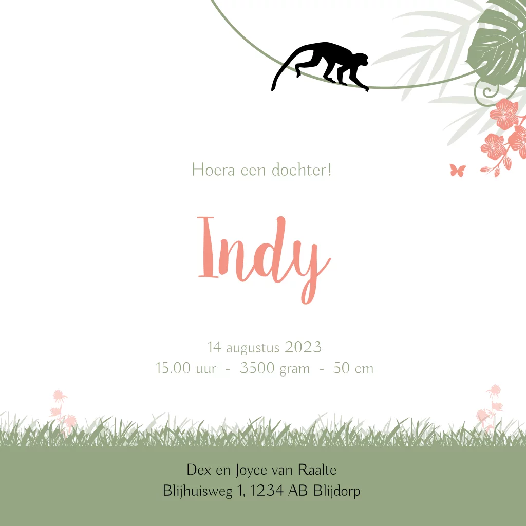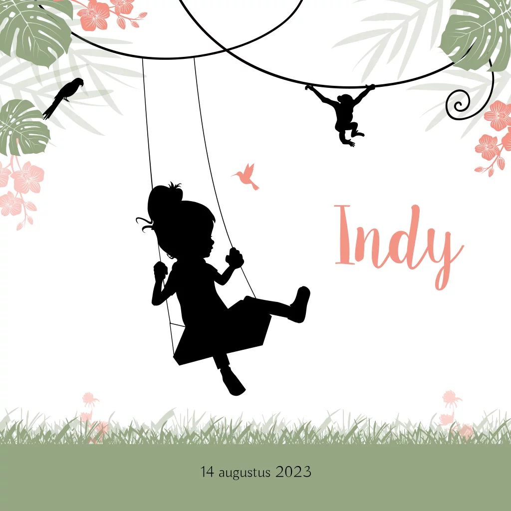 Hip silhouet geboortekaartje voor een dochter. Op dit kaartje Indy staat een meisje op de schommel in de jungle tussen de slingerende aapjes en vogels. De kleuren op dit kaartje zijn aan te passen.