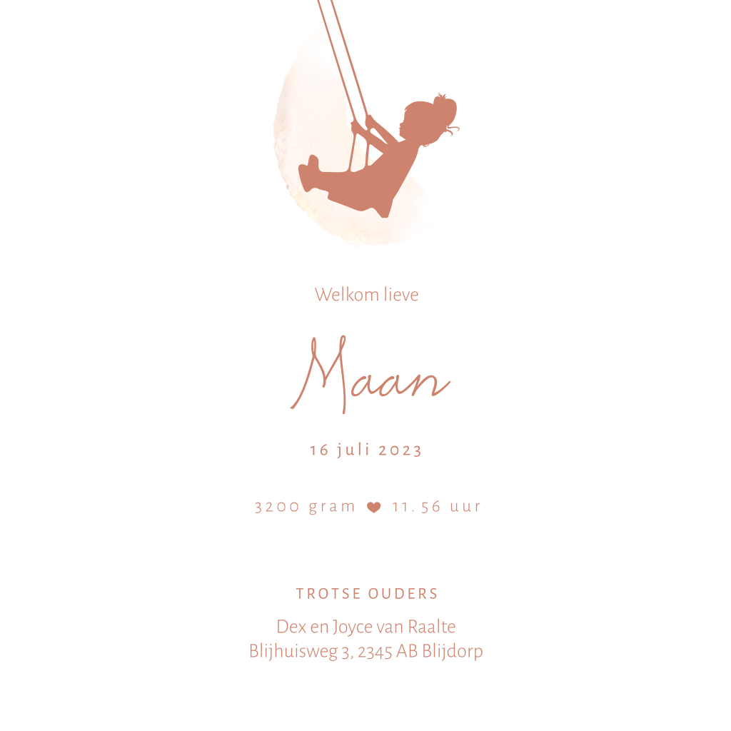Een vrolijk zomers geboortekaartje met het silhouet van een meisje op een schommel en mooie zonnebloemen. Twee kleine konijntjes kijken mee vanuit het gras. Dit kaartje Maan in trendy kleur terra is naar je eigen smaak aan te passen.