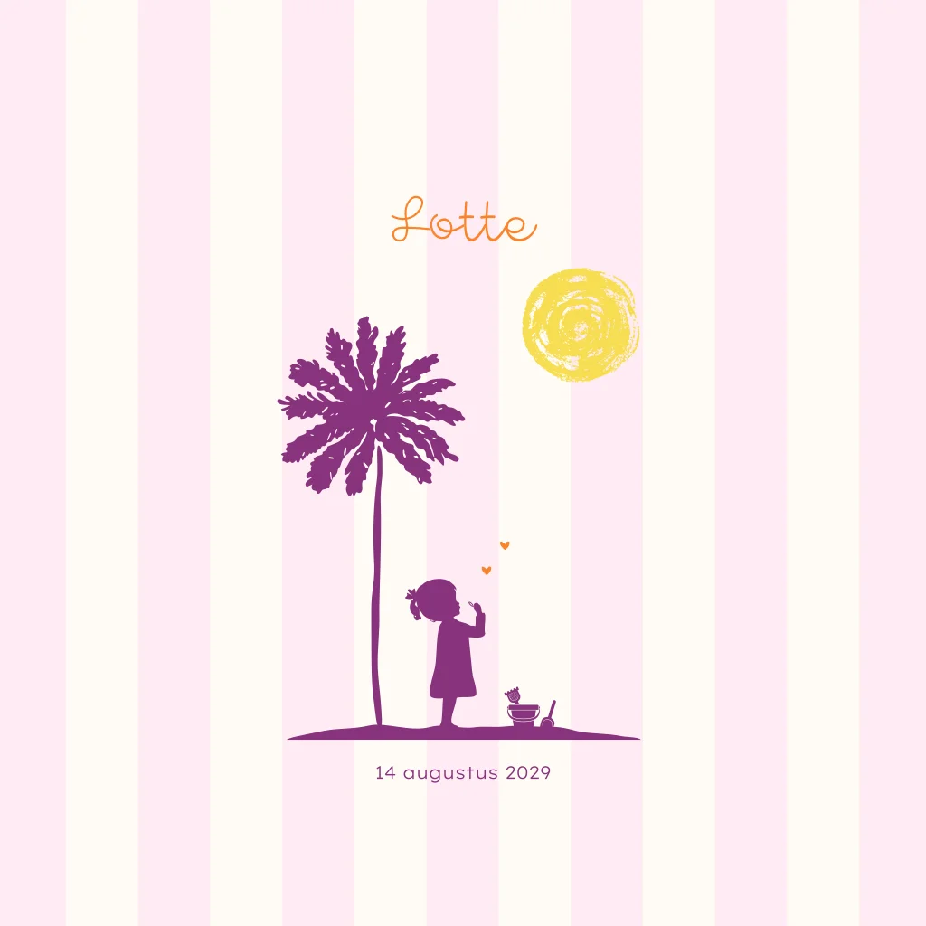 Zomers geboortekaartje voor een meisje. Op dit geboortekaartje Lotte zie je een silhouet van een meisje die bellen blaast op het strand. Op het strand zie je nog een palmboom en een emmer en schepjes. De zon staat te stralen. De roze met witte strepen geven een trendy uitstraling aan het kaartje.
