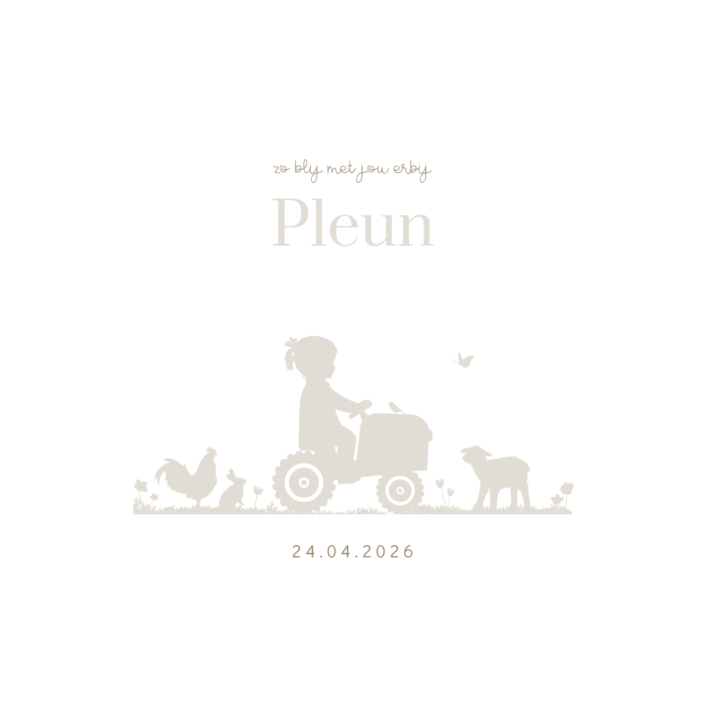 Ben je op zoek naar een uniek geboortekaartje voor jullie dochter? Bekijk dan eens dit silhouet geboortekaartje in zachte aardetinten! Op dit babykaartje Pleun zie je een meisje op een tractor met boerderij dieren waaronder een lammetje, haan en konijn. Helemaal geschikt voor een kindje dat in de lente wordt geboren. Teksten, kleuren en de gezinssamenstelling kun je eenvoudig aanpassen in de editor.