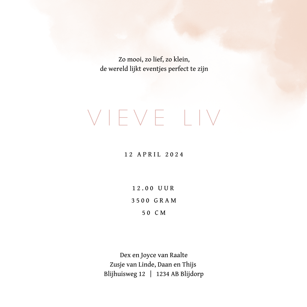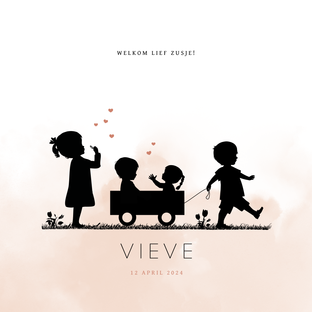 Geboortekaartje voor een zusje met het silhouet van 4 kindjes. Een grote zus blaast hartjes door een bellenblaas. Een grote broer loopt met een karretje waarin nog een broertje en een klein baby zusje zitten. Op de achtergrond een roze aquarel. Pas dit kaartje Vieve naar je eigen smaak aan de editor. Ook mogelijk met andere silhouetten of voor een andere gezinssamenstelling.