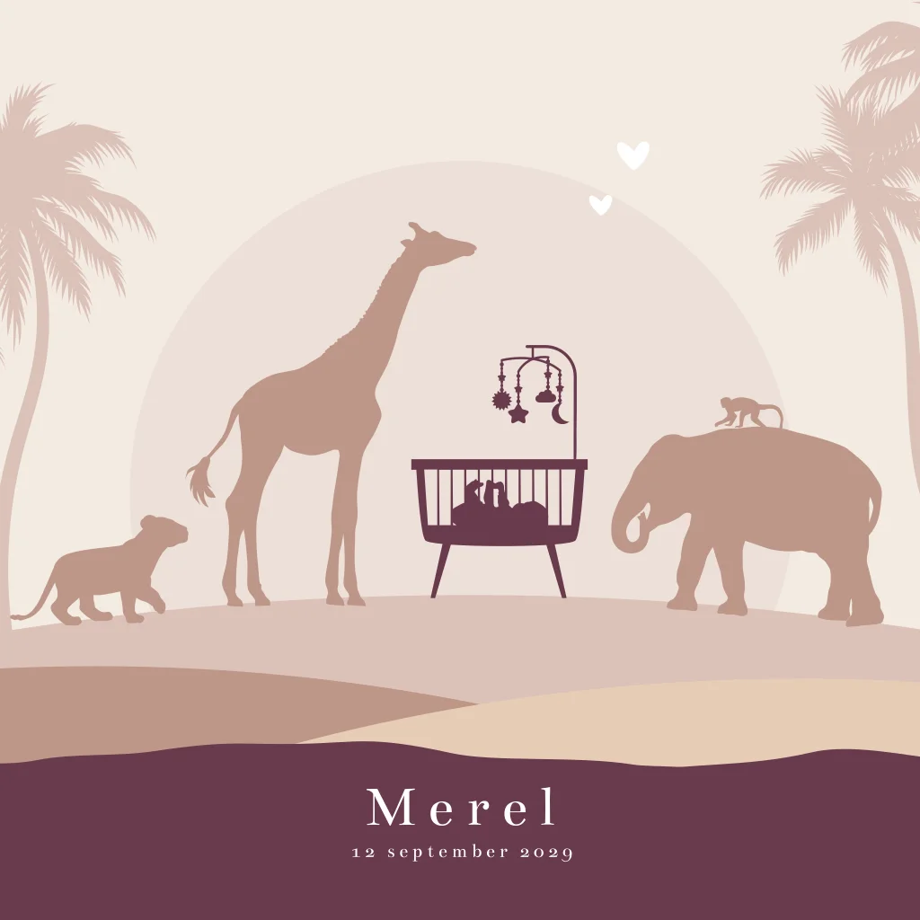 Jungle silhouet geboortekaartje voor een meisje in trendy kleuren. Op dit kaartje Merel ligt een kleine baby in een wiegje, omringd door een giraffe, welpje, olifant en een aapje. Op de achtergrond palmbomen, een heuvelachtig safari landschap en ondergaande zon. Teksten, kleuren en de silhouetten kun je gemakkelijk aanpassen in de editor. Dit silhouet geboortekaartje is ook mogelijk voor een andere gezinssamenstelling.