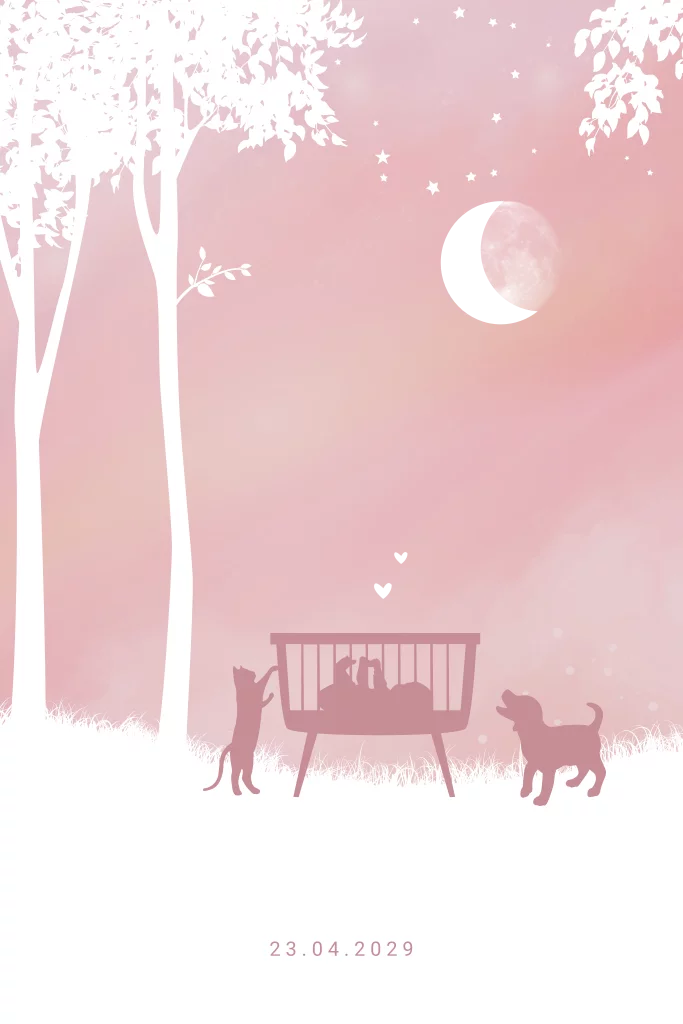 Een lief geboortekaartje voor een meisje. Op dit geboortekaartje zie je een silhouet van een baby in een wiegje met daaromheen een kat en een hond. Het wiegje staat onder de maan met sterren met daarnaast de bomen. Dit geboortekaartje bevat goudfolie wat zorgt voor een extra vleugje luxe. Maak dit kaartje in stijl af met de bijpassende berry envelopkleur.